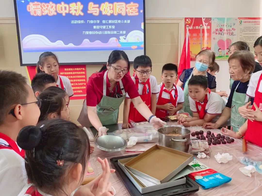 9月18日,九亭小学联合亭汇党总支部组织队员们举行“情浓中秋 与你同在”社会实践活动。在志愿者叔叔阿姨们对月饼制作过程详细的讲解后,队员们在经过揉团、包馅、成型等一系列程序,成功完成月饼制作。之后,在大队辅导员刘老师和亭汇居委汤书记的带领下,队员们带上包装好的手工月饼穿街走巷,亲手送上自己制作的月饼和中秋节贺卡向社区老党员派发月饼。活动中队员们感受到阖家团圆之乐,也了解中国传统节日的魅力。