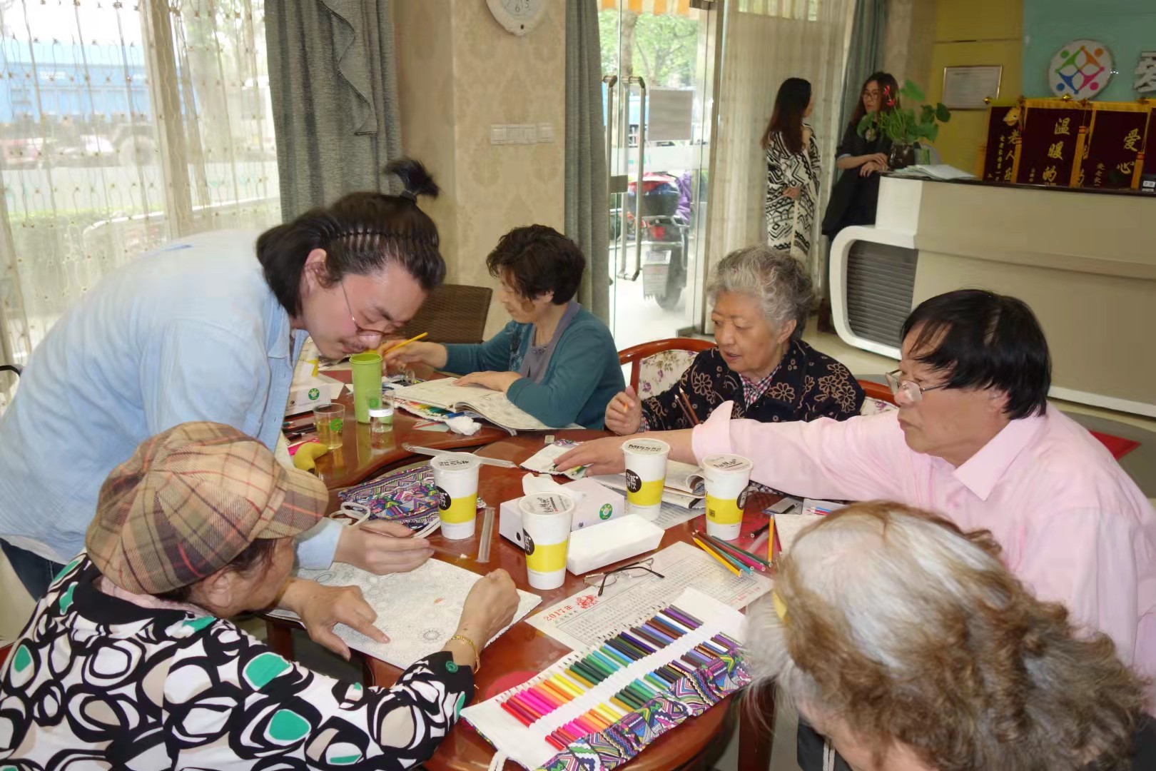 江宁路街道爱老家园,一场专为轻度和中度认知障碍的老年人开设的集中康复课堂上,美术老师正指导一位老年人通过图画填色进行康复训练……这是江宁路街道从2013年在全国率先开展“老年失智社区非药物干预”项目的一个缩影。
