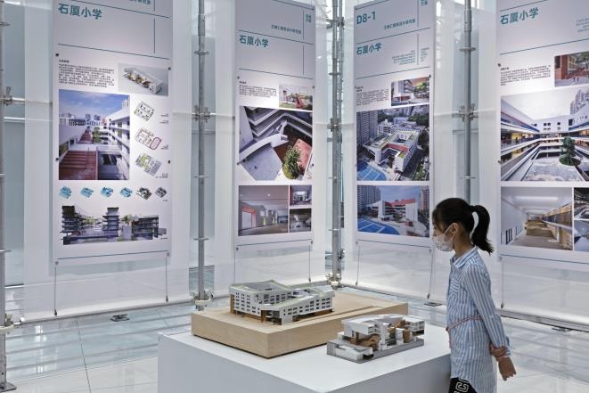 此部分共有27个方案参展,均为近年来的上海落成项目,包含了大学、中学、幼儿园等各种学校类型。以方案图纸、建筑模型、方案动画、建筑师访谈等方式较为全面展示了上海近年来的学校设计在社区融入、教育教育创新等方面的探索与发展。