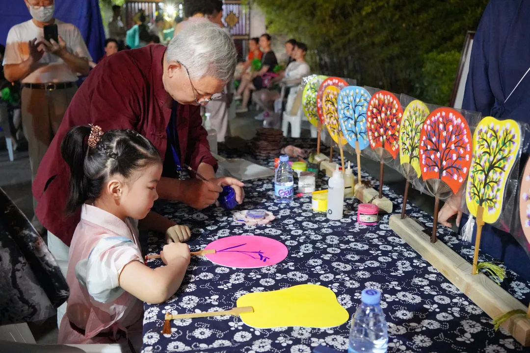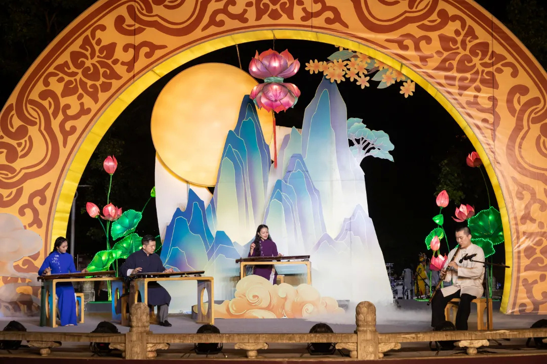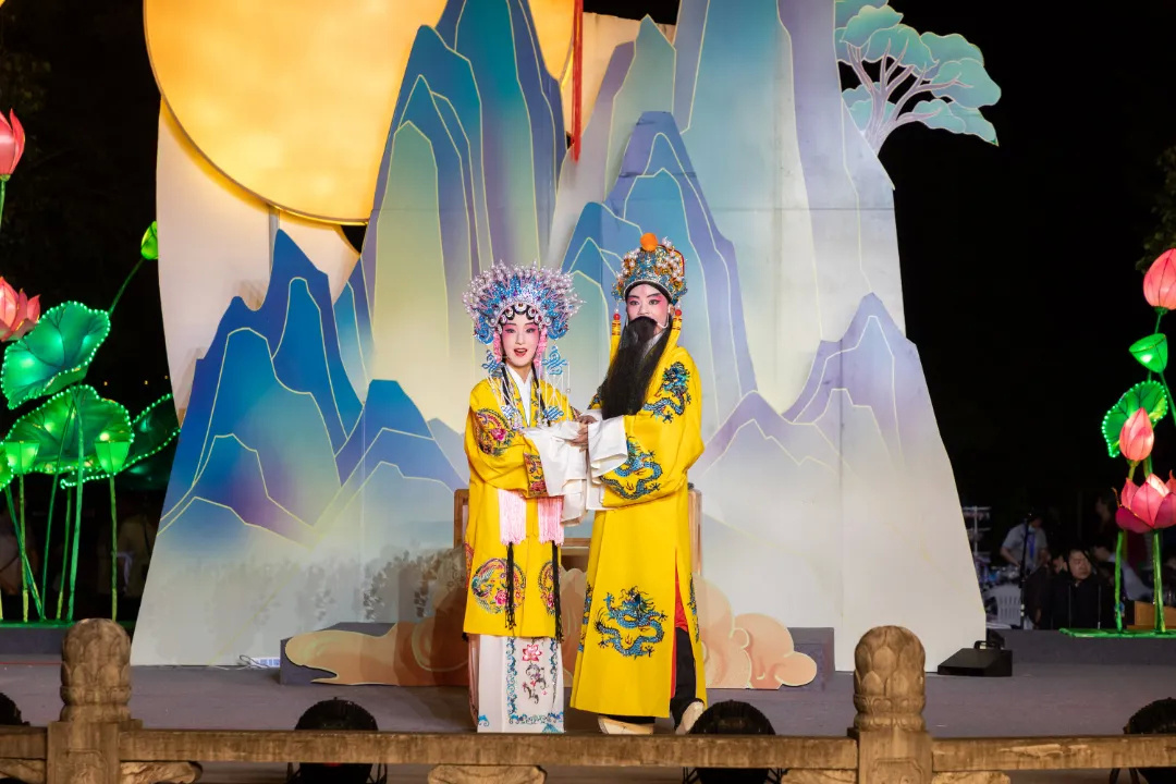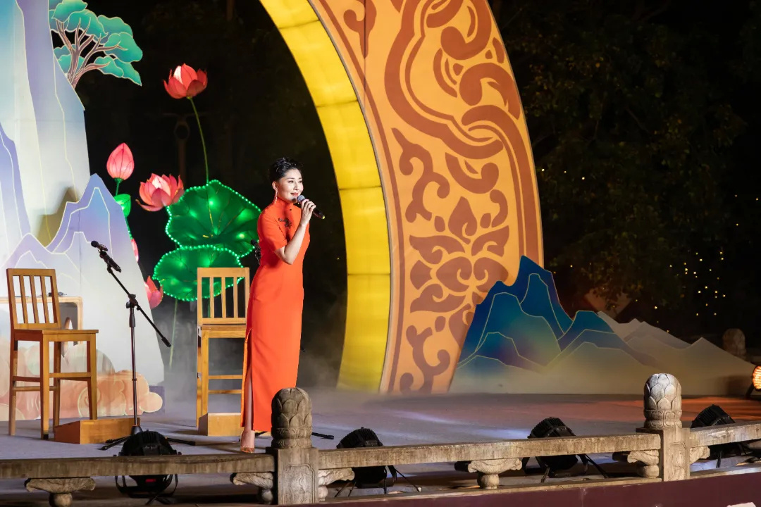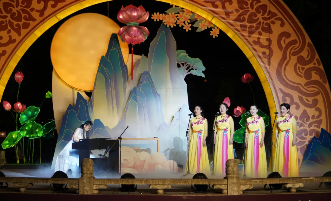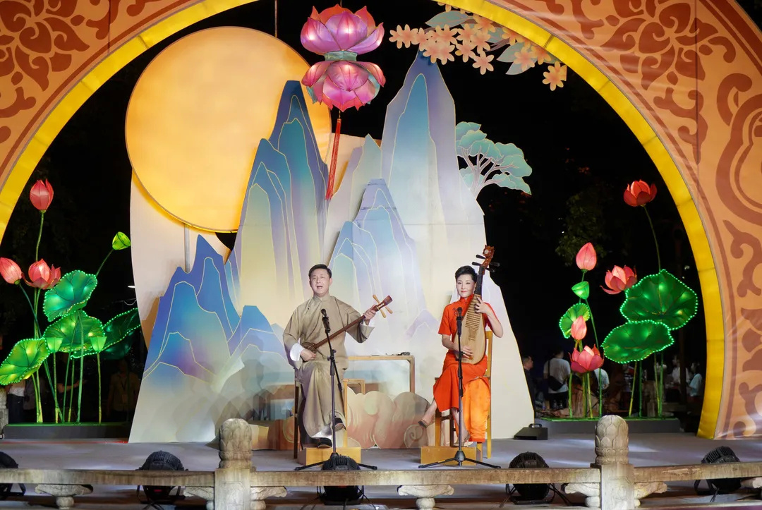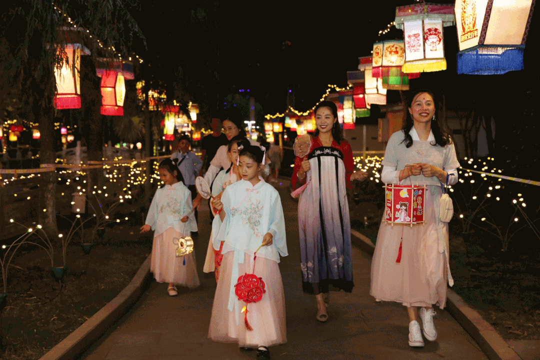 古琴吟唱《拨棹歌》、中阮演奏《渔舟唱晚》、弹词《白蛇传·赏中秋》以及“一期一会”茶艺情境表演等,加上园内处处古朴雅致的花灯布景、身着汉服“走月亮”的古风少年,让市民恍若置身于古代。