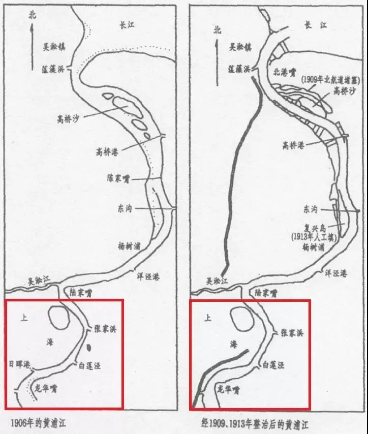 由图中疏浚前后对比图可以明显看到,龙华嘴一段在疏浚工程中更凸,此举有助于对岸航道加深形成方便停船的港口,但也使得水流速度加快。而龙华嘴对岸便是今时今日的黄浦江徐汇滨江段水域。