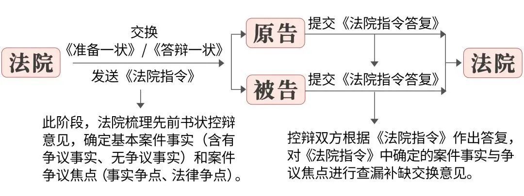 “书状先行”一般表现为三轮交锋,但根据其内容所达到的效果,又不局限于三轮。下面以流程示意图形式,向你揭秘“书状先行”于诉讼中的基本行进过程。