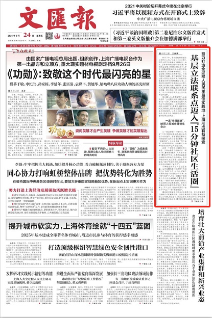 9月24日,《文汇报》头版刊发通讯《基层立法联系点迈入“15分钟社区生活圈”》。