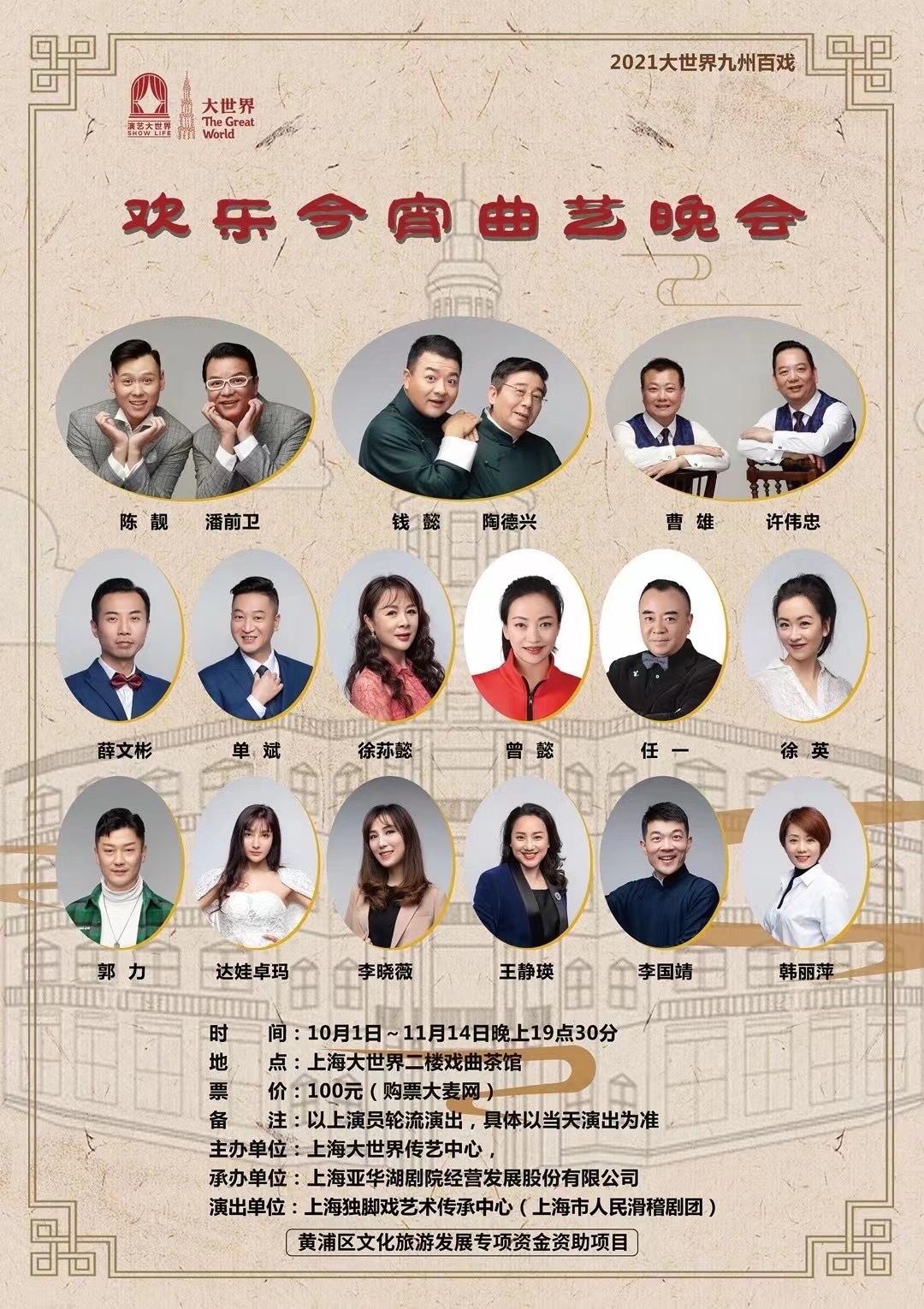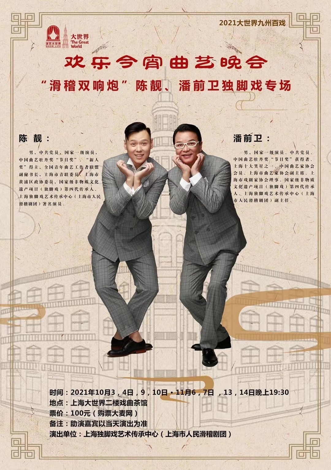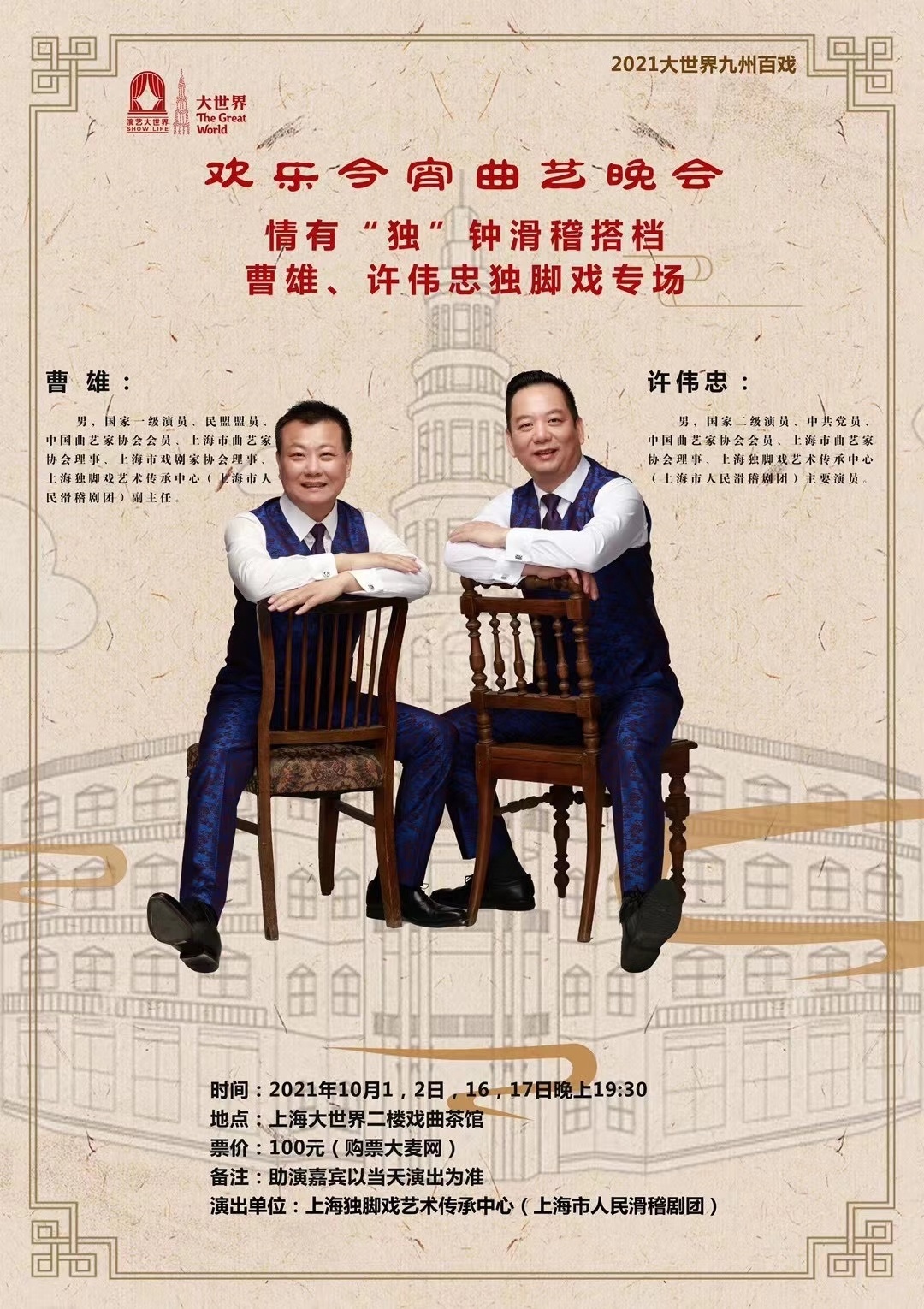 上海独脚戏艺术传承中心(上海市人民滑稽剧团)精心打造的“欢乐今宵曲艺晚会”将于国庆期间闪亮登场上海大世界演艺夜市二楼戏曲茶馆。该中心也成为上海首个长档期驻演小剧场的专业滑稽表演团体。
