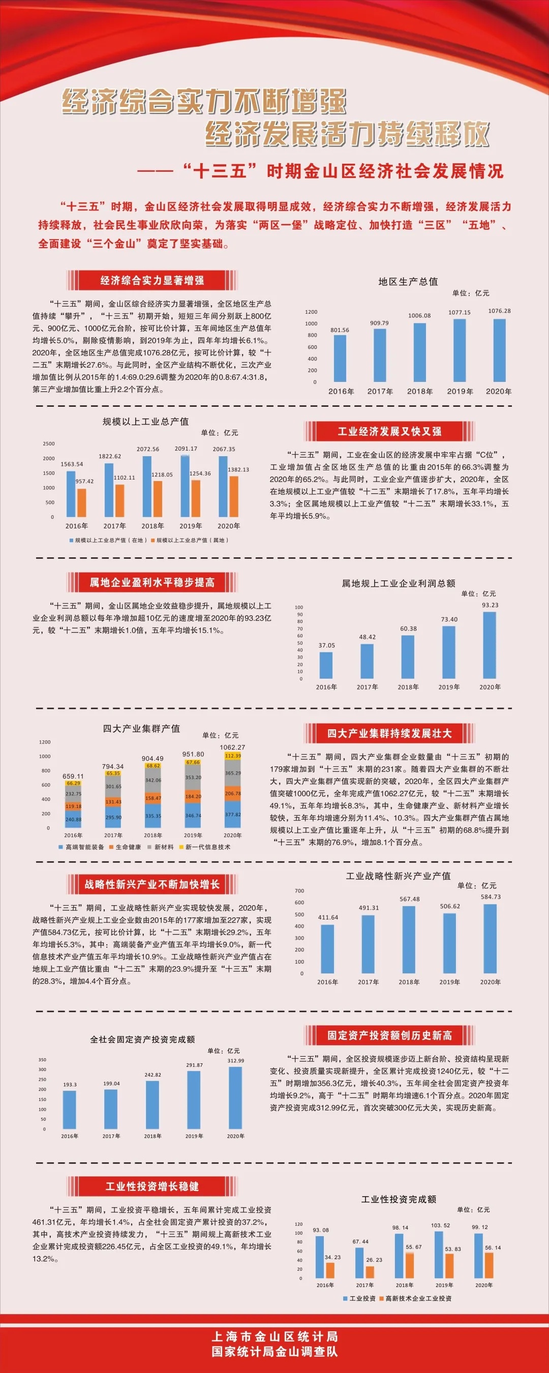 据统计,在“十三五”期间,金山各项经济社会发展指标迈上新台阶。地区生产总值突破千亿大关,工业产值增幅居全市前茅,社会消费品零售总额较快发展,商品销售总额平稳增长,五年间居民人均可支配收入年均增长8.2%,高于全市平均增幅0.5,我区就业环境也得到了较大改善,2020年新增18575个就业岗位。此外,五年来金山区研发经费投入持续增加、强度有所提高,科技创新加强汇聚,工业高新技术企业快速增长。
