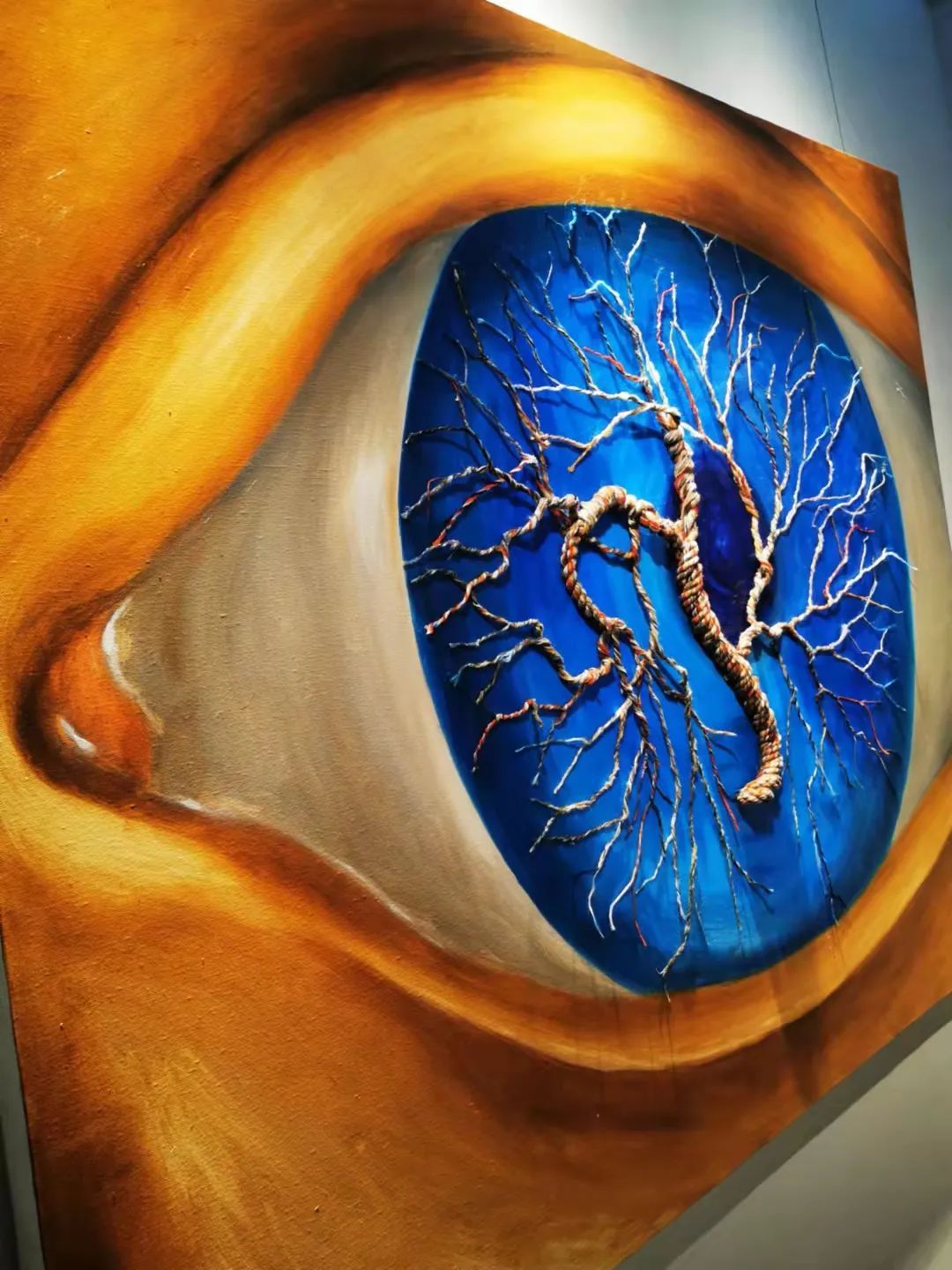 刘维亚特别赞赏的这幅作品,看似以绘画方式表现“眼睛”,实际上在绘画底色上,运用不同的材料,粗细不一的花线绳组成一棵树的造型,中间是瞳仁,周围则是密布交织的视网膜和神经系统,丰富的想像力和对材料的综合运用让人耳目一新。