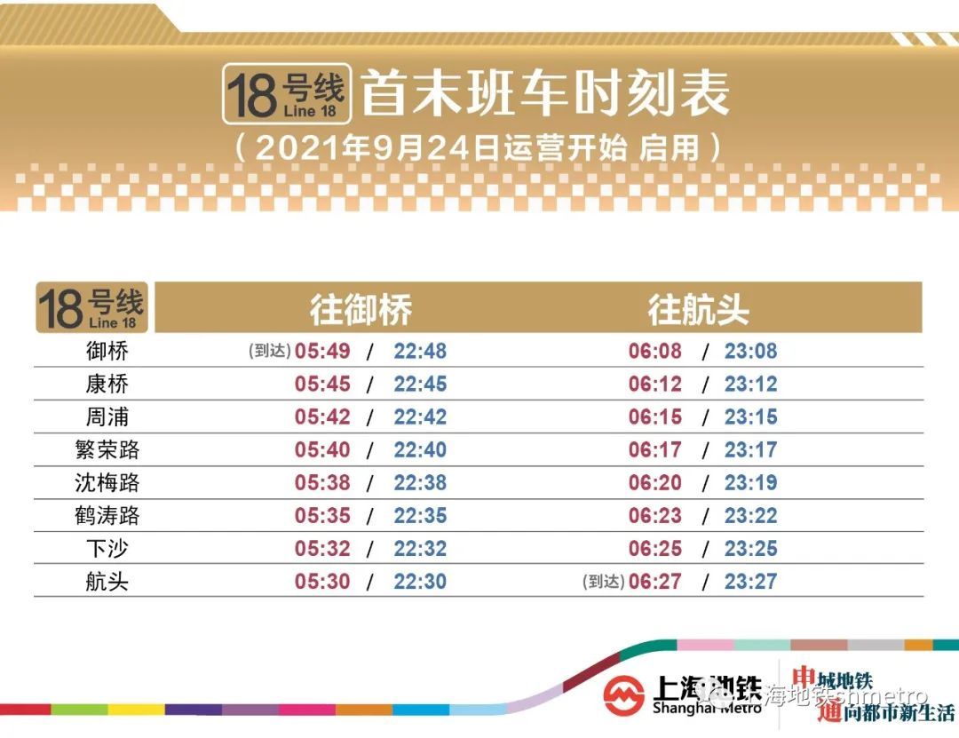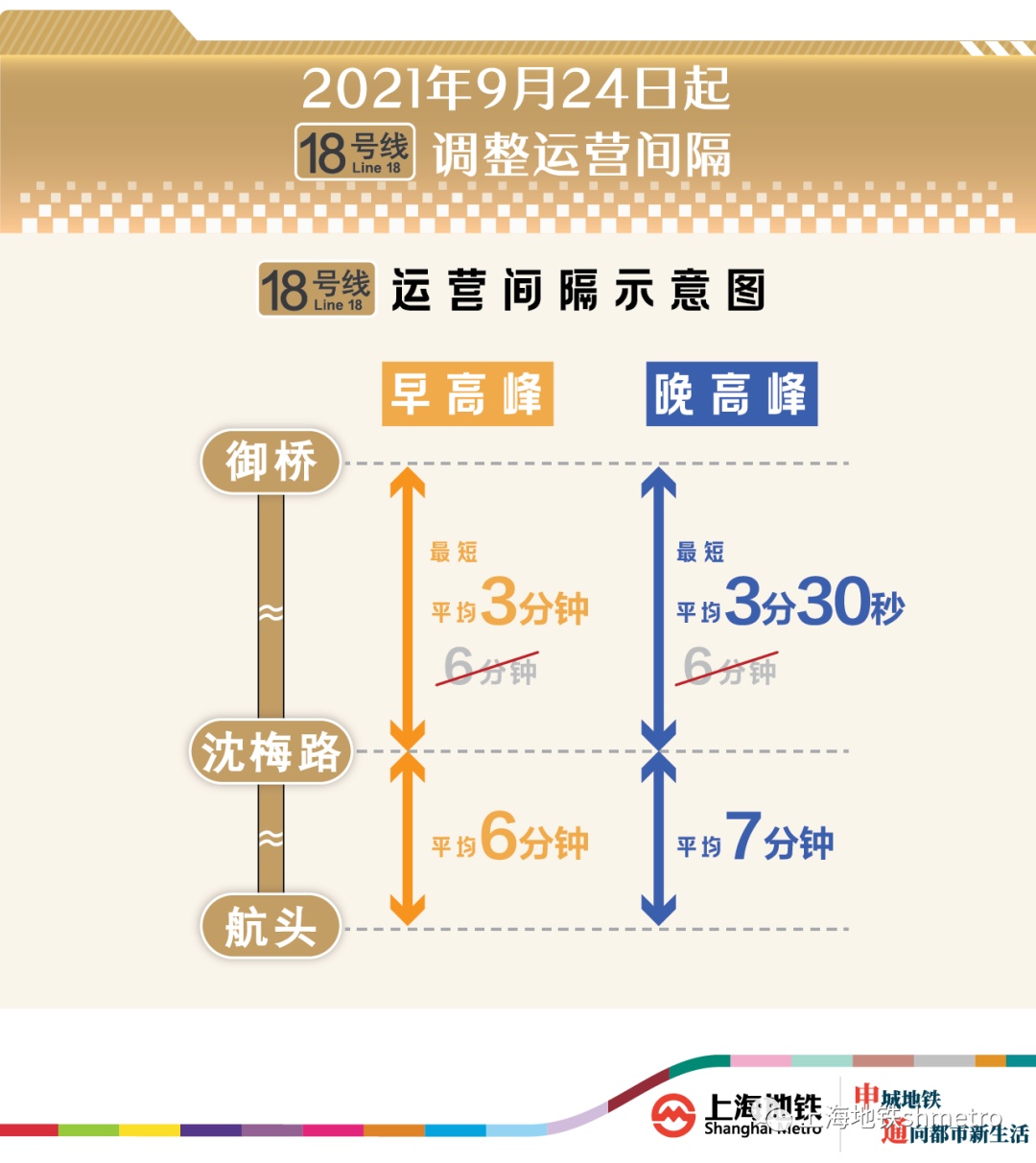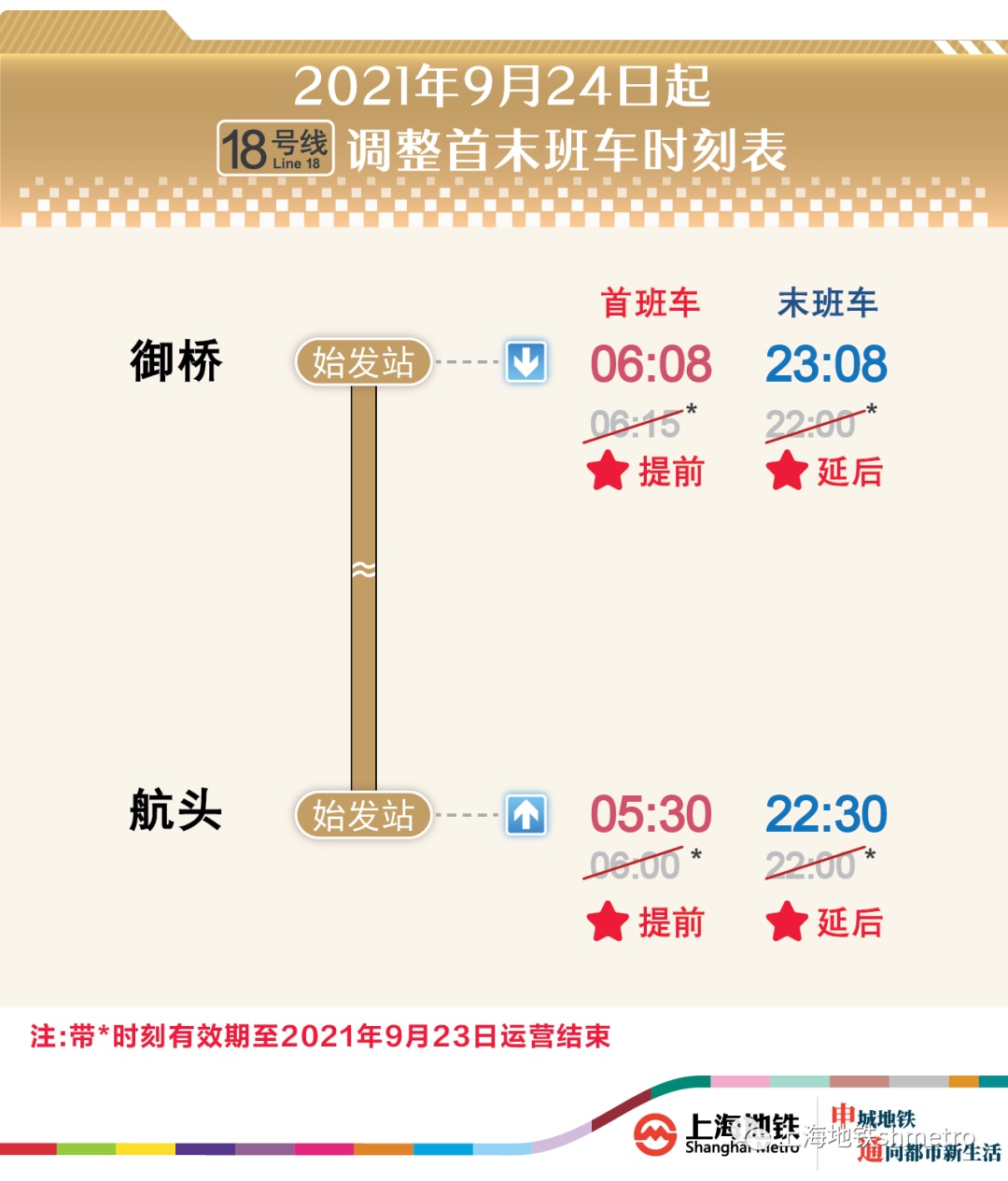 从9月24日起,上海地铁18号线(航头~御桥)首末班车时间将调整:首班车提前,末班车延后,同时,部分区段高峰运营间隔也将缩短。详见↓