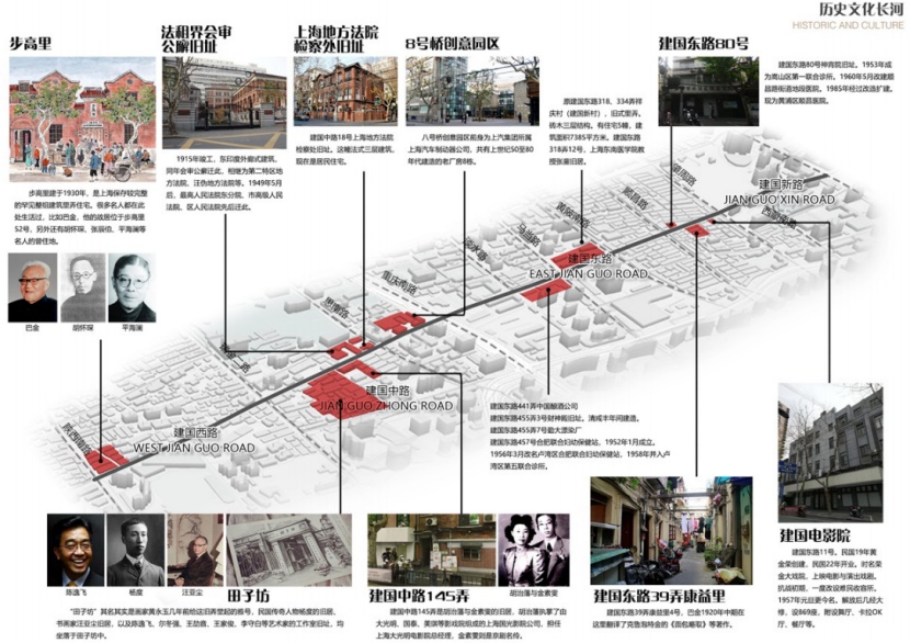 本次所设计的道路是由建国西路(陕西南路-瑞金二路)、建国中路(瑞金二路-重庆南路)、建国东路(重庆南路-肇周路)与建国新路(肇周路-西藏南路)组成,道路单侧全长约为2400米,道路虽较为狭窄,但来往的车辆及行人还是较为密集的。道路两侧多为居民区,且以肇周路为“交界”,其西侧多为海派老上海弄堂建筑,东侧则为现代简洁的多层居民楼。两侧的业态为丰富,恒基旭辉天地与中海环宇荟坐落于设计道路的中部。沿线的文化教育类场地则较为集中的分布于淡水路的西侧。