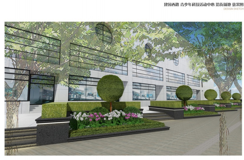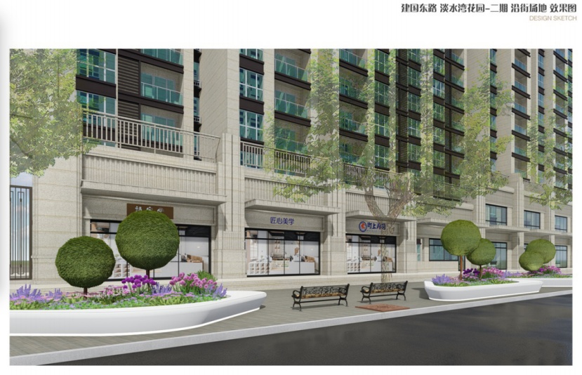 淡水湾花园的建筑是Art deco风格,建国东路北侧恒基商场也是现代化建筑风格,故而拟在淡水湾花园沿线宽敞的人行步道上增添异形的花坛,丰富道路的层次,为道路两侧的建筑增添一段衔接纽带。