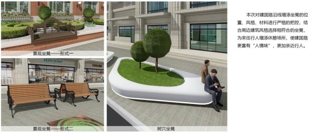 本次对建国路沿线增添坐凳的位置、风格、材料进行严格的把控,结合周边建筑风格选择相符合的坐凳,为来往行人增添休憩场所,使建国路更富有“人情味”,更加亲近行人。