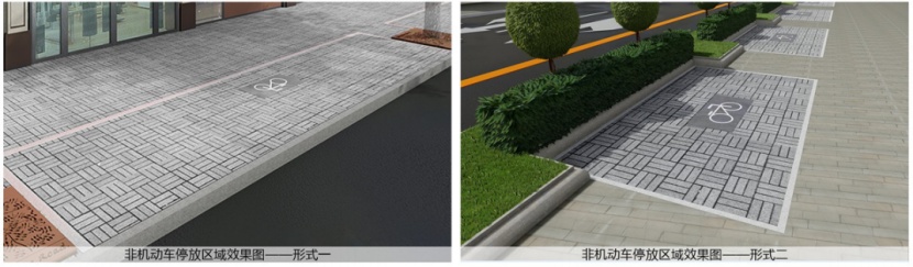 建国路沿线的非机动车停车位较为零散,故而本次设计对非机动车停车位进行整合、删减,重要路口节点处若无交通需求,非机动车停车位予以取消,保留小区出入口及保留重点区域的停车区域,部分区域结合人非绿化带进行改造,保证城市界面的整齐统一,并且更加便于后期的管理整治工作。