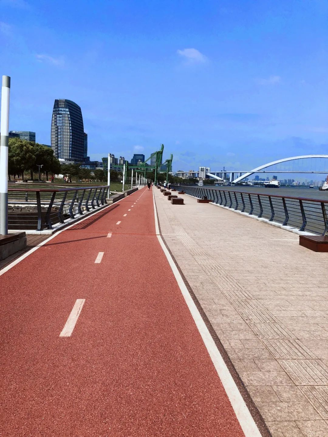 斜土街道徐汇滨江(斜土段)健身步道总长1585米,平均宽度3-4米,步道面层采用彩色沥青浇筑,增强了步道标识线的清晰度,并提升了工艺以适应户外多变的天气,为市民提供了更舒适的跑步体验。此外,健身步道周边的体育设施(篮球场、休闲营地、滑板公园、攀岩运动场、自行车道等)也成为了大家运动休闲的“打卡圣地”。