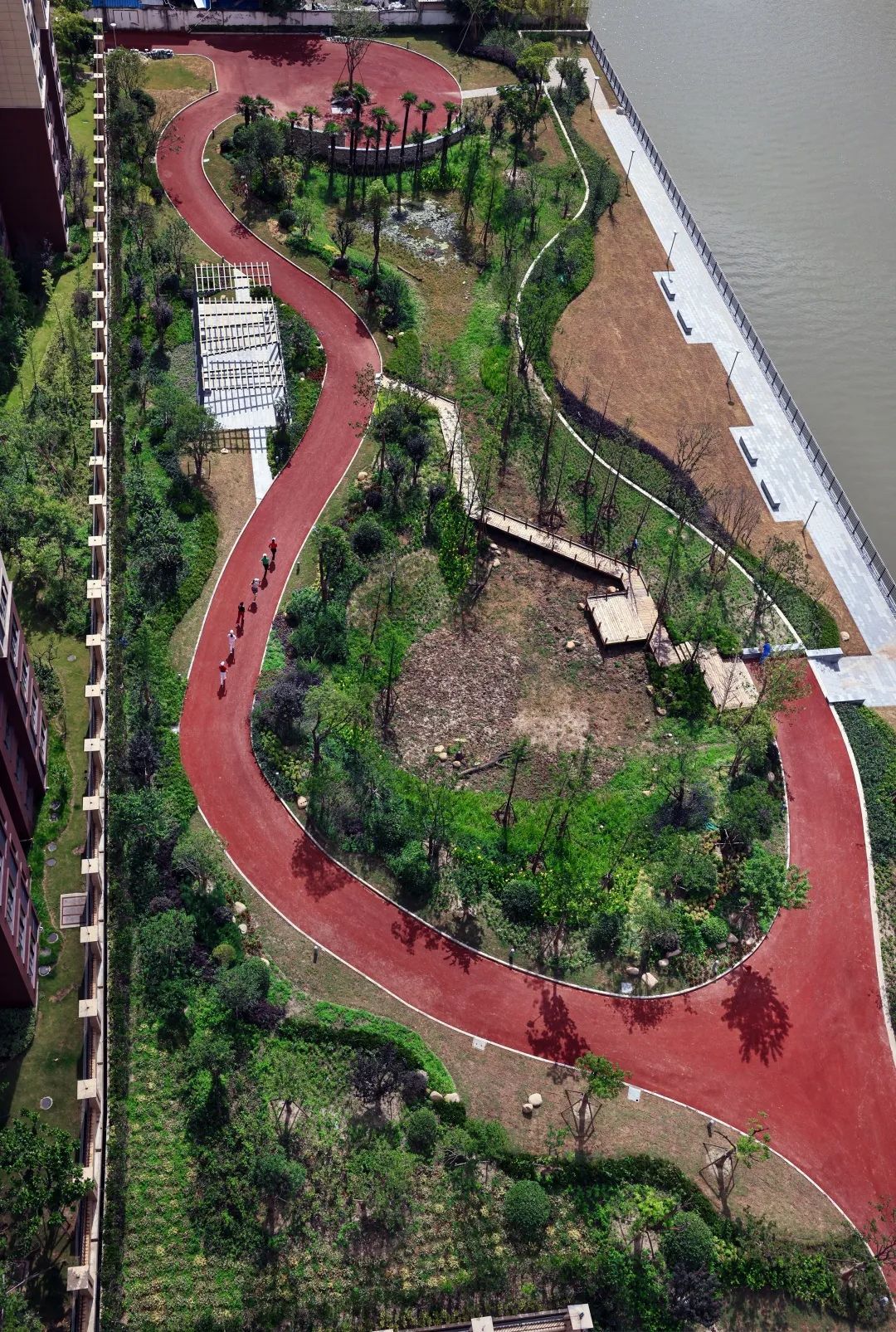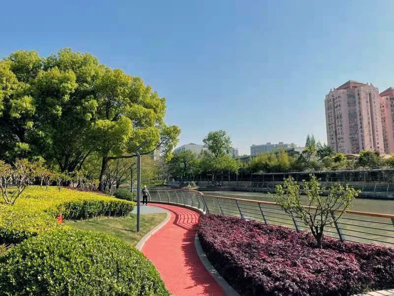 蒲汇塘滨水健身步道系徐汇区蒲汇塘(宜山路至漕宝路)两岸景观提升工程。该步道主要为2米宽彩色沥青混凝土道路,少量为透水砖面层道路和青石板道路,其中彩色沥青道路共计4300平方米。通过对原有滨水腹地空间的梳理、改造,优化现有场地形态,该步道形成了特征鲜明、充满活力的休闲健身广场和动步活动空间,方便了周边居民使用体验。
