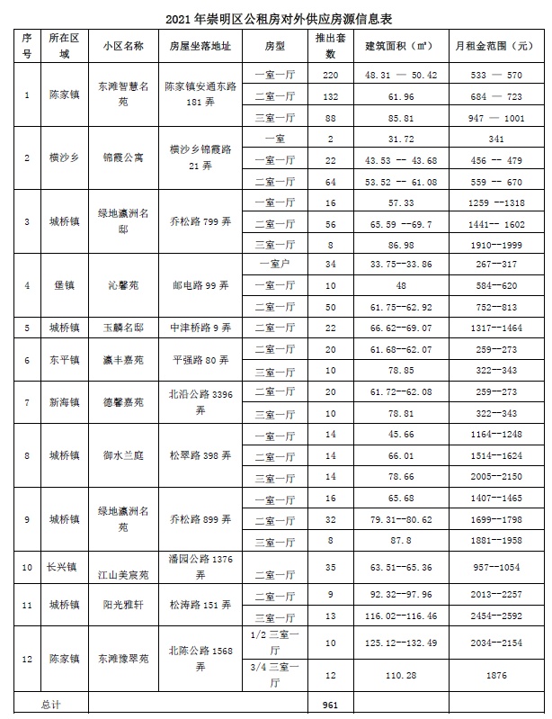 截至目前,上海市崇明区公共租赁住房建设运营管理有限公司已累计完成开发建设公共租赁住房总建筑面积约6万平方米, 961套公租房房源、140套廉租房房源,房源分布于长兴镇、横沙乡、陈家镇、堡镇、东平、新海、城桥镇等7大乡镇。公租房的房租金略低于市场价,另外物业管理费均由上海市崇明区公共租赁住房建设运营管理有限公司承担,具体项目情况、相关下载与租金情况可点击文末“阅读原文”查看。