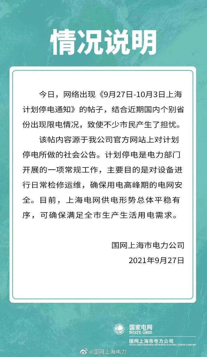 这两天,一份名为《9月27日—10月3日上海计划停电通知》的帖子通过社交网络传播。根据该帖子,上海有多个地区将计划停电,同时涉及居民用电和商业用电。有网友担心,此次停电是否与部分城市的拉闸限电相类似?