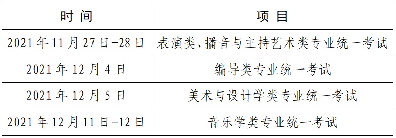 2022年艺术类专业统一考试报名与高考报名同时在网上进行,考前由考生自行下载打印准考证。考试时间安排如下: