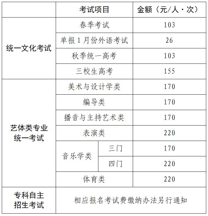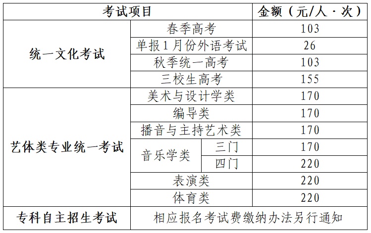 根据《关于上海市教育考试院有关考试收费等问题的复函》(沪价费〔2006〕005号、沪财预联〔2006〕1号)、《关于调整上海市教育考试院外语口语考试等收费标准的复函》(沪价费〔2003〕069号、沪财预〔2003〕第104号)文件规定,文化考试收费标准:报名费为每项考试25元/人(专科自主招生报名考试费另行通知),考试费为每项考试每科目26元/人;艺体类考试收费标准:报名费为每项考试20元/人,考试费为每项考试每科目50元/人。各类考试项目须缴纳费用如下表所示: