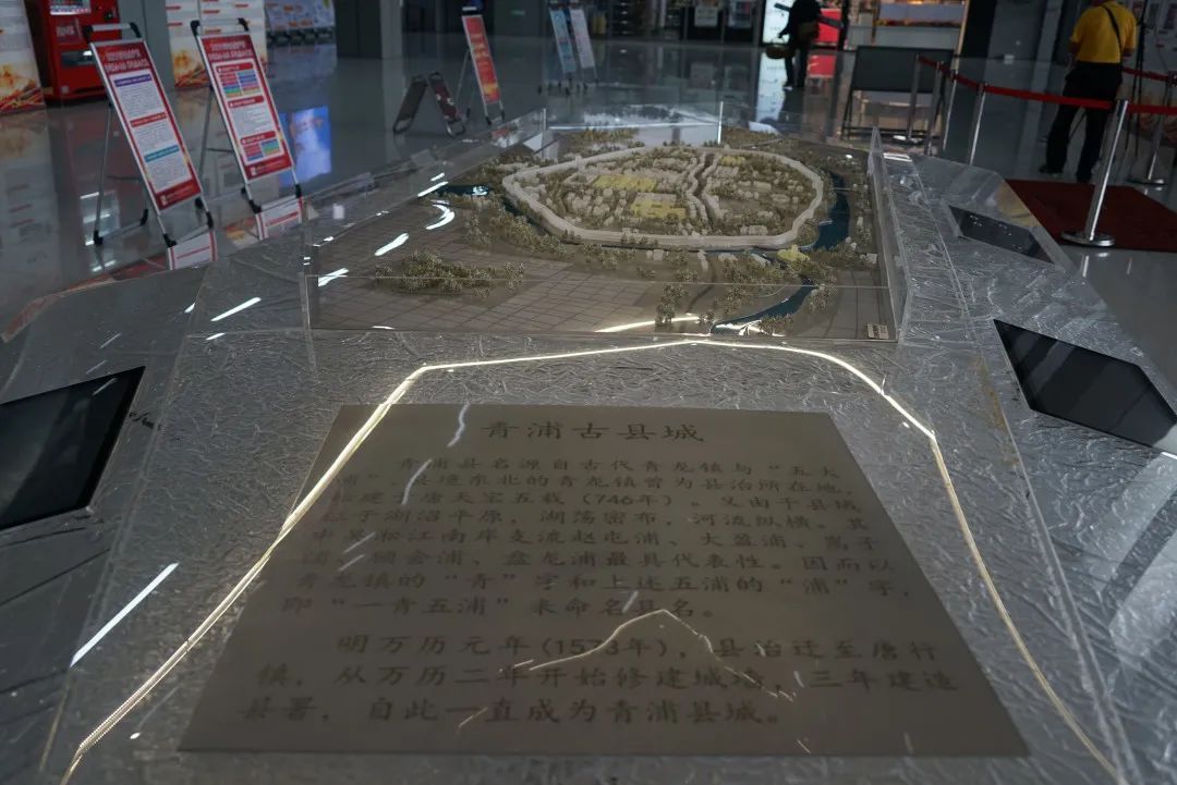 站内的“一青”是入站大厅六边形基座水晶展台,展台上放置青浦县城模型,展台四周和上方穿孔铝板上安装屏幕和画框,作为青浦历史影像的展示区,影像越到上面越现代,就像福泉山遗址地层的古老堆积一样;站内的“五浦”是天花板上的穿孔铝板流向,按照实际人流的走向,形成“五浦”水流的意向,把人流引导向每个出入口,安装在上的投影灯将“五浦”的名字投射到地面上。当乘客经过展台,按照导引走入各出入口,就像从500多年前的青龙镇,经过“五浦”(赵屯浦、大盈浦、崧子浦、顾会浦、盘龙浦),走向现代的青浦,仿佛见证了历史的变迁,见证了中国共产党带领中国人民创造的一个又一个伟大奇迹,使我们对未来充满自信和憧憬。