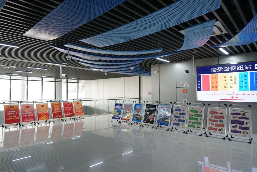 从大厅水晶展台的青浦历史展示区和“五浦”(赵屯浦、大盈浦、崧子浦、顾会浦、盘龙浦)水流式的人流引导投影灯到二楼乘客休憩的现代化共享书吧,着力打造智慧阅读空间;从色彩缤纷导乘清晰的候车大厅到富有现代化建设的安全信息中心和公益宣传阵地,为乘客提供一个明亮、舒适、有序、安全的候车空间。通过空间大改造,深植文化之根,青浦区交通行业主管部门努力打造“文化场站”品牌,着力把漕盈路公交枢纽打造为青浦区公交场站建设的标杆,成为青浦的“新地标”、“网红打卡点”。