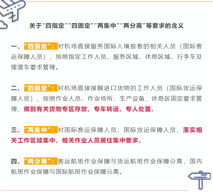 该决定指出,机场地区各驻场单位和境内外航空运输企业应当按照“四指定”“四固定”“两集中”“两分离”等要求,对“人、物、环境”实施严格的疫情管控措施。