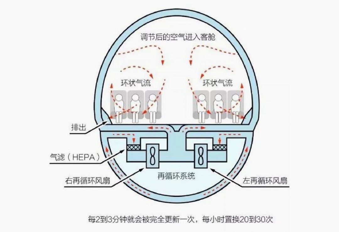 其实飞机在设计时已考虑了运行过程中的通风要求。通常情况下飞机客舱每2~3分钟置换一次空气,每小时置换20~30次,并都配有高效过滤器(HEPA)。
