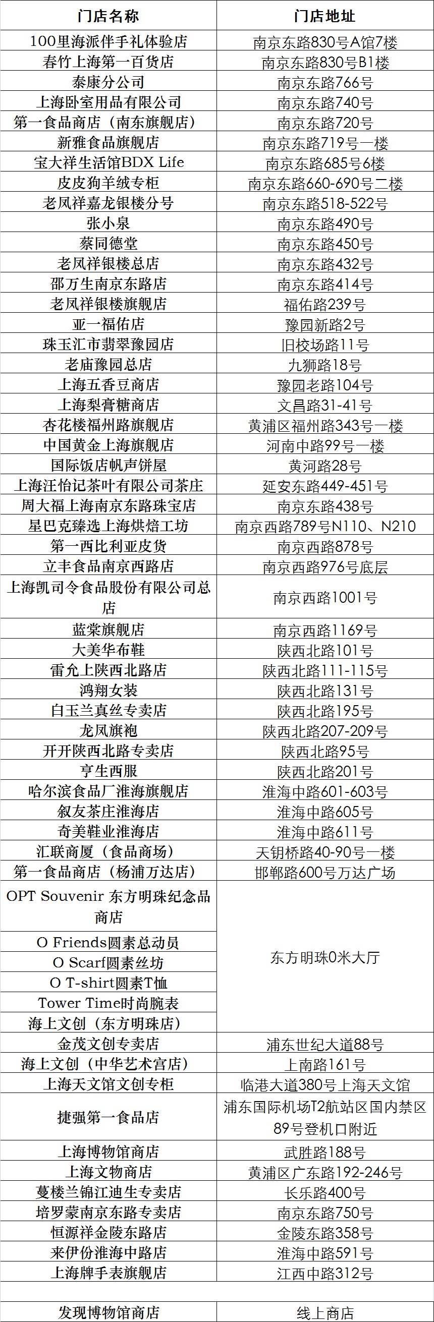 线下58家实体店中,大多数位于往来宾客较多的商圈商街,也有在地标性旅游景点和交通枢纽处;线上1家为发现博物馆商店,让游客在游览的同时,近距离就能买到上海特色商品。