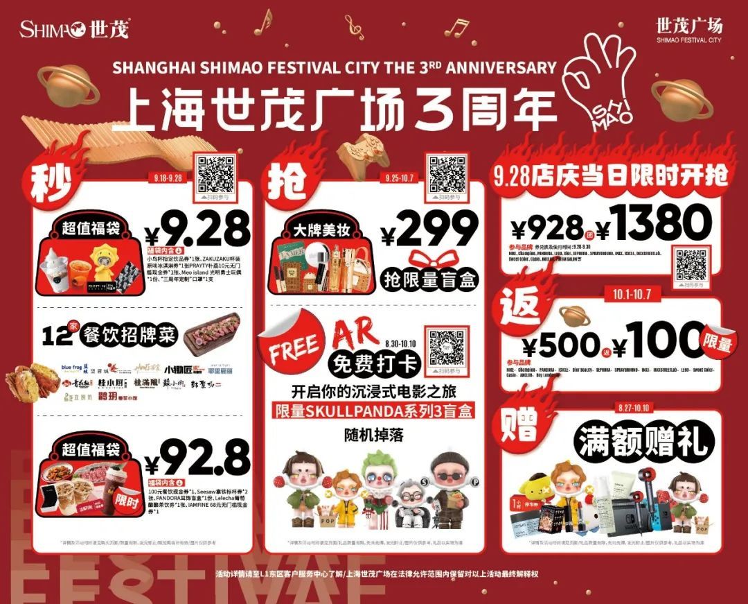 作为三周年庆力度最大的促销礼遇活动,“92.8元福袋秒杀购”活动于9月28日店庆当日限时开抢,内含100元餐饮券、Seesaw任意表杯券、PANDORA耳坠盲盒等超值好物。