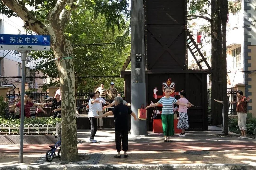 苏家屯路是四平路街道的“明星道路”,从早到晚都聚集了大量的人气。这条前后不足300米的小马路,是上海市十大景观道路之一。这里集中了健身、涂鸦、艺术等多种文化,不同年龄的社区居民都可以在这里找到自己的乐趣。早上来这里,听听阿姨们唱戏跳舞,傍晚来看看孩子们的嬉闹玩耍,晚上参与到“暴走一族”,在苏家屯路总能感受到最市井的生活。策展团队也在苏家屯路新增了狮子椅和导览图,让更多的居民了解到附近的公共设施。