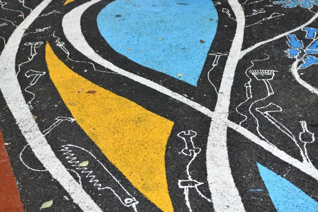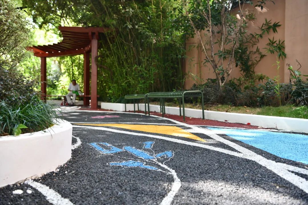 《工具之花》街边花园也是此次艺术季的新作品。坐落在抚顺路鞍山路路口的这个街边花园原本阴暗脏乱,是一个卫生死角。通过破除原有的破旧围挡,将空间开放给社区居民;布置袖珍绿植景观和地面铺装,提升场地的品质。花台和地面地面的流线型设计,都来源于街角的一颗向阳花种子,这些线条如同植物藤蔓顺势生长,不断变换色彩和形态,生出各类工具形态的果荚和花朵。工具的应用,则来源于上海老工人新村的回忆。正如设计团队所表达的,“大量产业工人为上海的建设做出了贡献,如今他们年纪大了,我们希望通过小公园的开辟和地绘的创作,让他们劳动的记忆重新绽放,他们可以给儿孙辈份工具识图,讲述工具的知识,传承文化,再放新花。”
