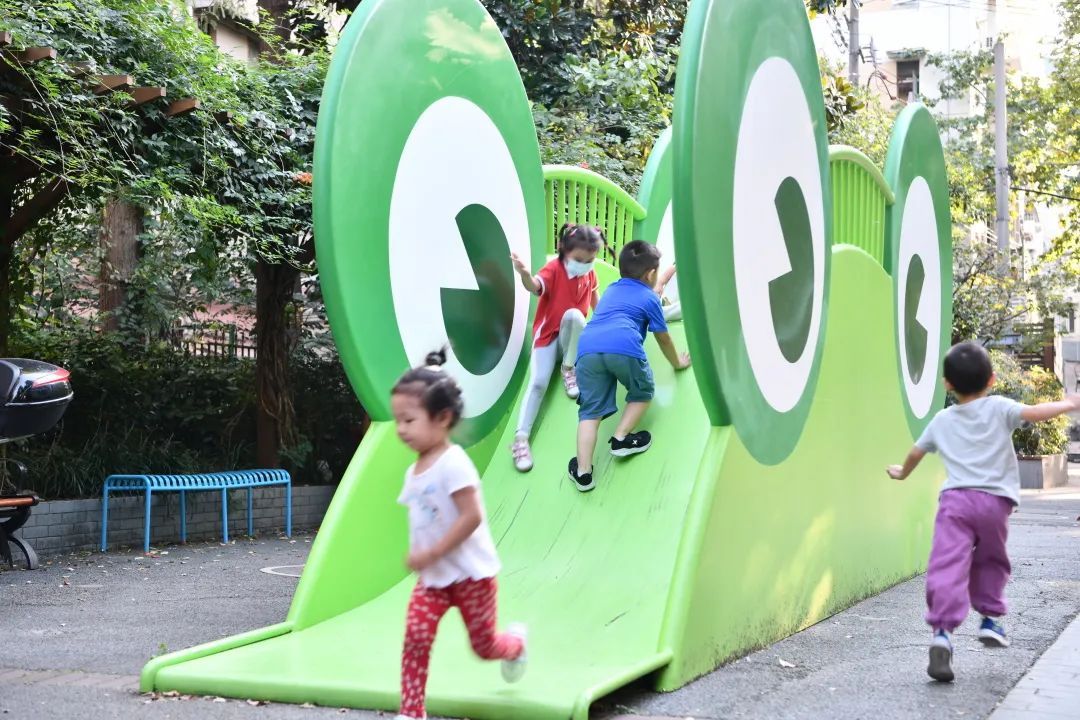 作为此次艺术季的新作,策展团队在狭小的社区街道引入了一个迷你“动物园”,希望在小场地也能够带来大地艺术的尺度感。因此,一个超级体量的青蛙王子从大地浮出,露出超大的眼睛环顾四周,熊猫宝宝也从另一侧爬出地面,四处张望,他们好奇地寻找社区的小朋友们,邀他们一起来玩耍。他们庞大的身体似乎掩藏在地下,无形中从视觉效果上拓展了社区空间的尺度想象力。这两个超级宽大的动物滑梯,可以一家人一起滑下,也可以很多小朋友手拉手一起玩。更多的小动物椅子在青蛙王子和熊猫宝宝的召唤下从草丛和树林中跑出来和社区的小朋友们玩成一片。