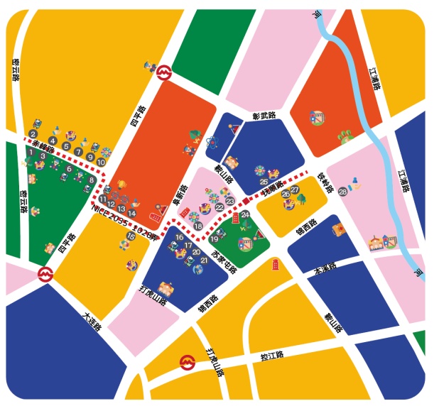 一条游览线路:抚顺路-苏家屯路-阜新路-四平路1028弄-赤峰路,沿线途径四平社区文化中心、抚顺路睦邻中心、阜新路睦邻中心、NICE好公社、赤峰路N-ICE2025未来生活原型街等多个社区更新项目。