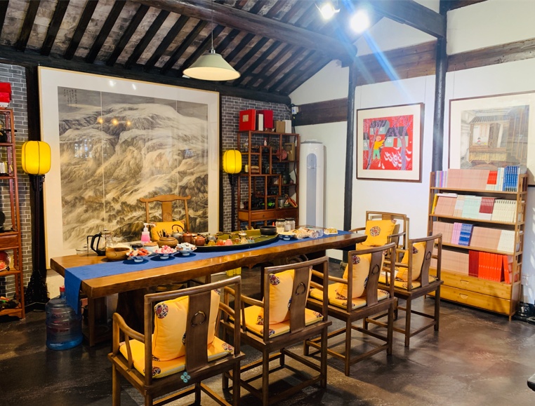 王洪吉入驻后,最先做的便是与镇村两级负责人共同协商后,对内部空间进行功能规划,以软装进行艺术改造。保留了四合院内的古树,增添了与四合院风格相匹配的微景观,摆放了可供喝茶休憩的凉亭;东西两侧的三间厢房与北面正屋的七间的中式房,则按照功能打造成工作室、会客厅、课堂与民俗画展示区等,以民俗画为主要装饰,每一间房风格相近、统一,但又各有各的韵味。