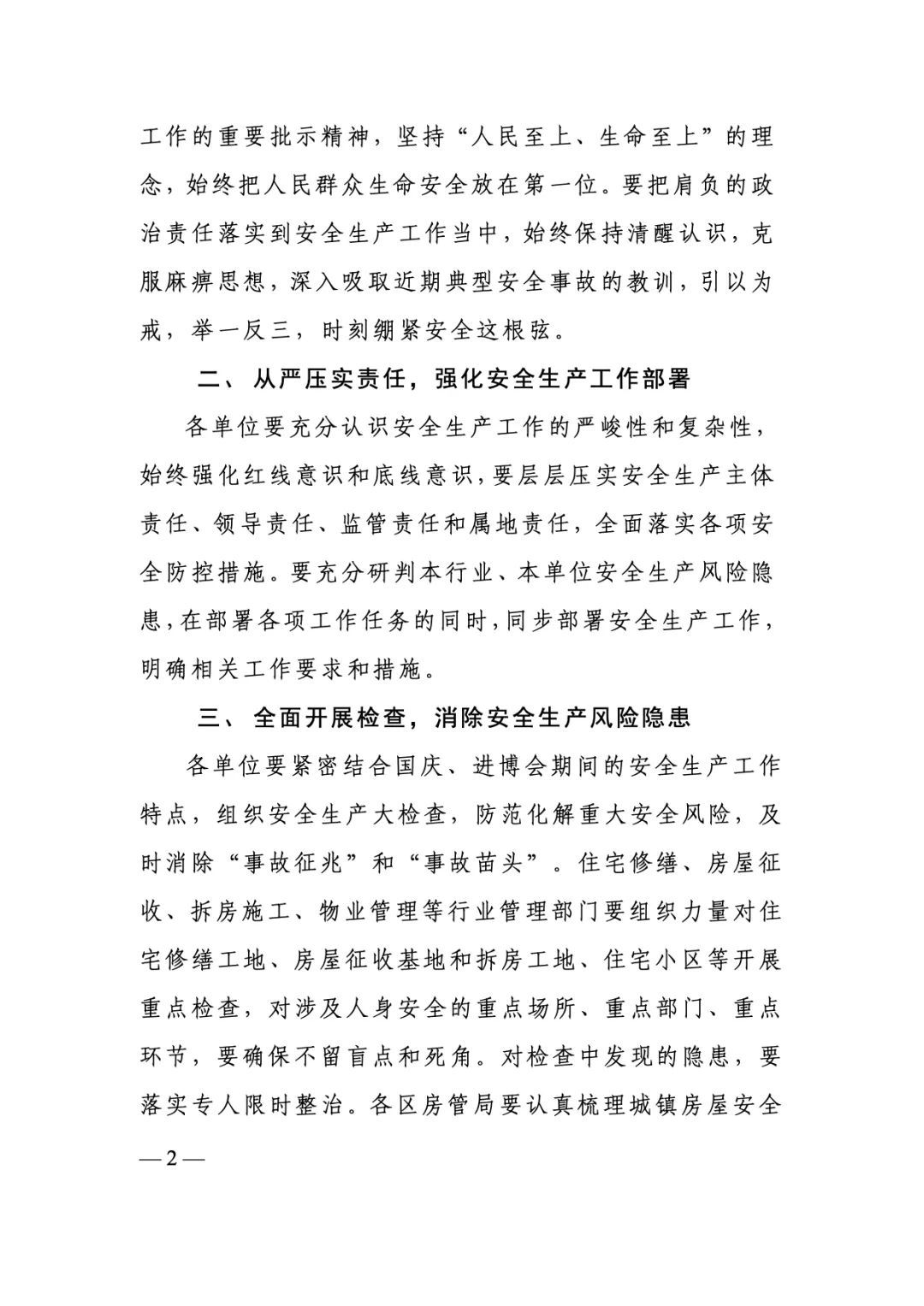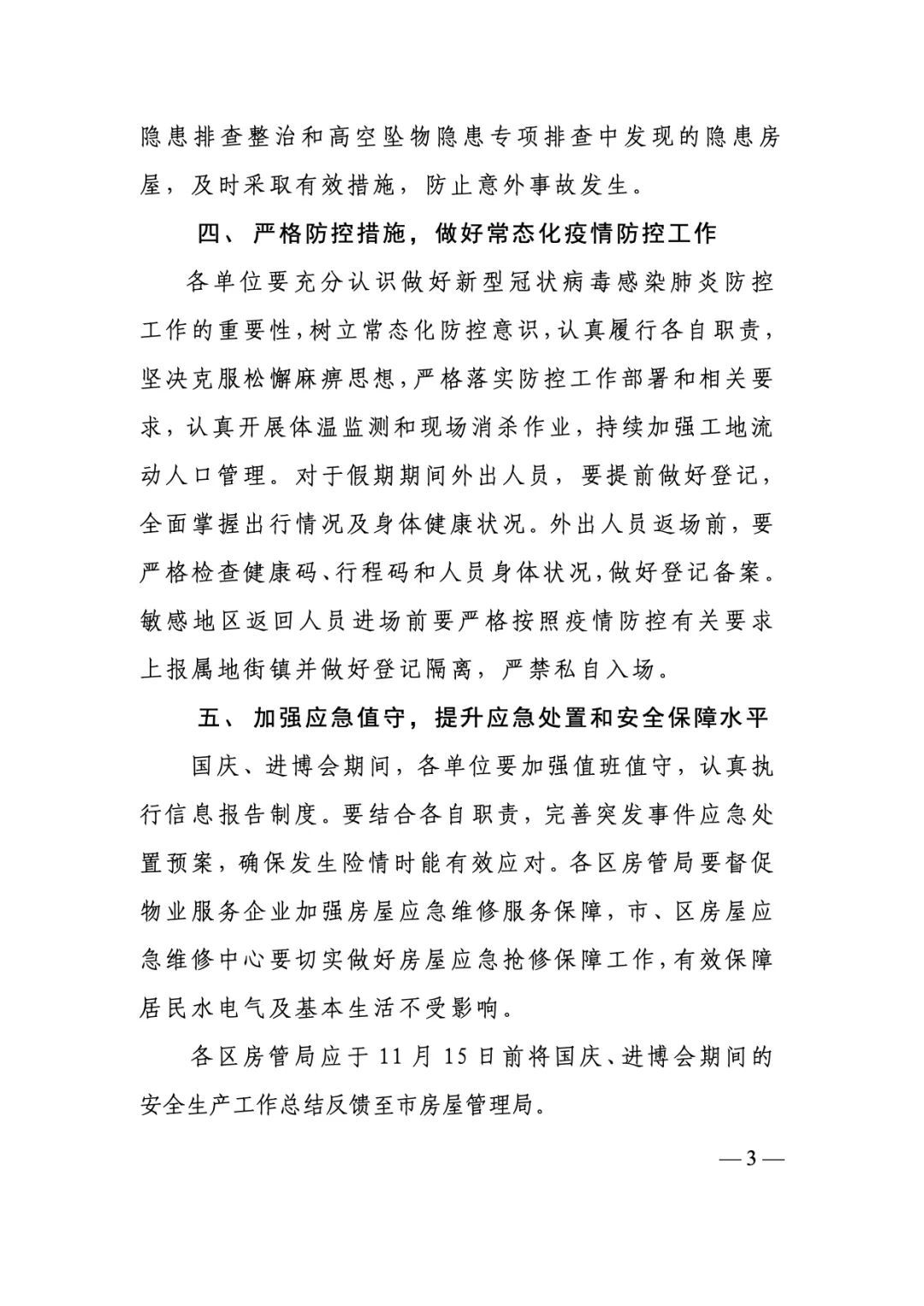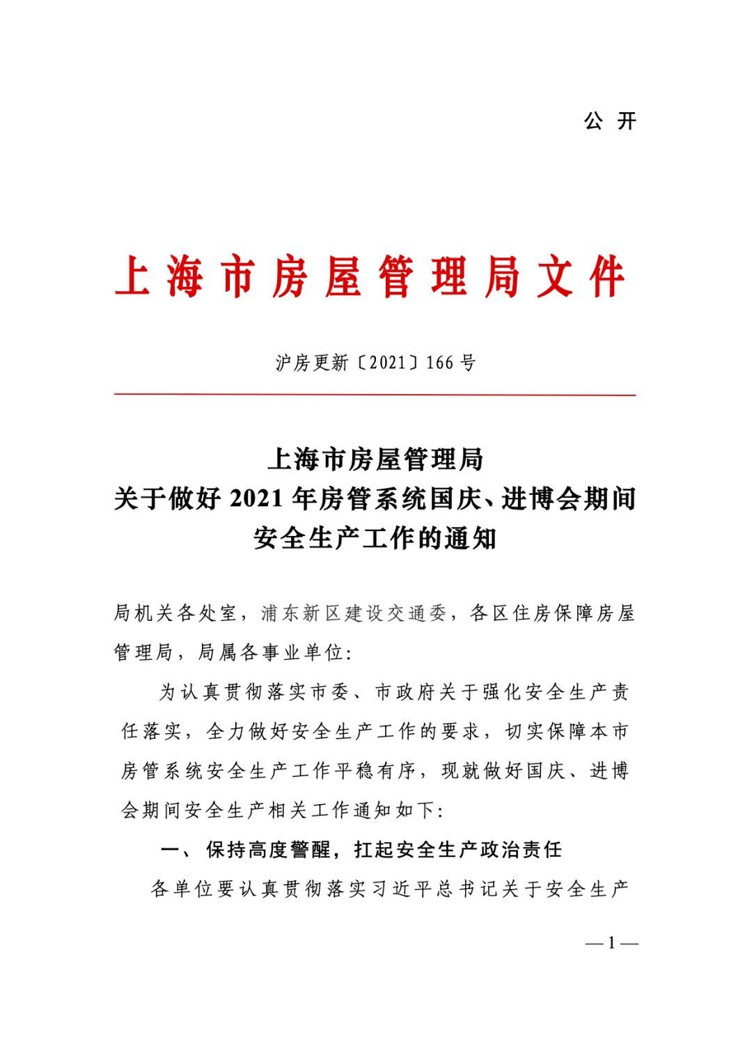 为贯彻落实市委、市政府关于安全生产的各项工作要求,保障市房管系统安全生产工作平稳有序,市房屋管理局印发《关于做好2021年房管系统国庆、进博会期间安全生产工作的通知》(沪房更新〔2021〕166 号),全面部署落实国庆期间安全生产工作。