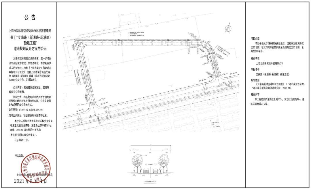 项目基地处于浦东新区北蔡南新地区,道路南起新浦路交叉口北侧,往北转向东再转向南至新浦路交叉口北侧,全线呈倒U字型。