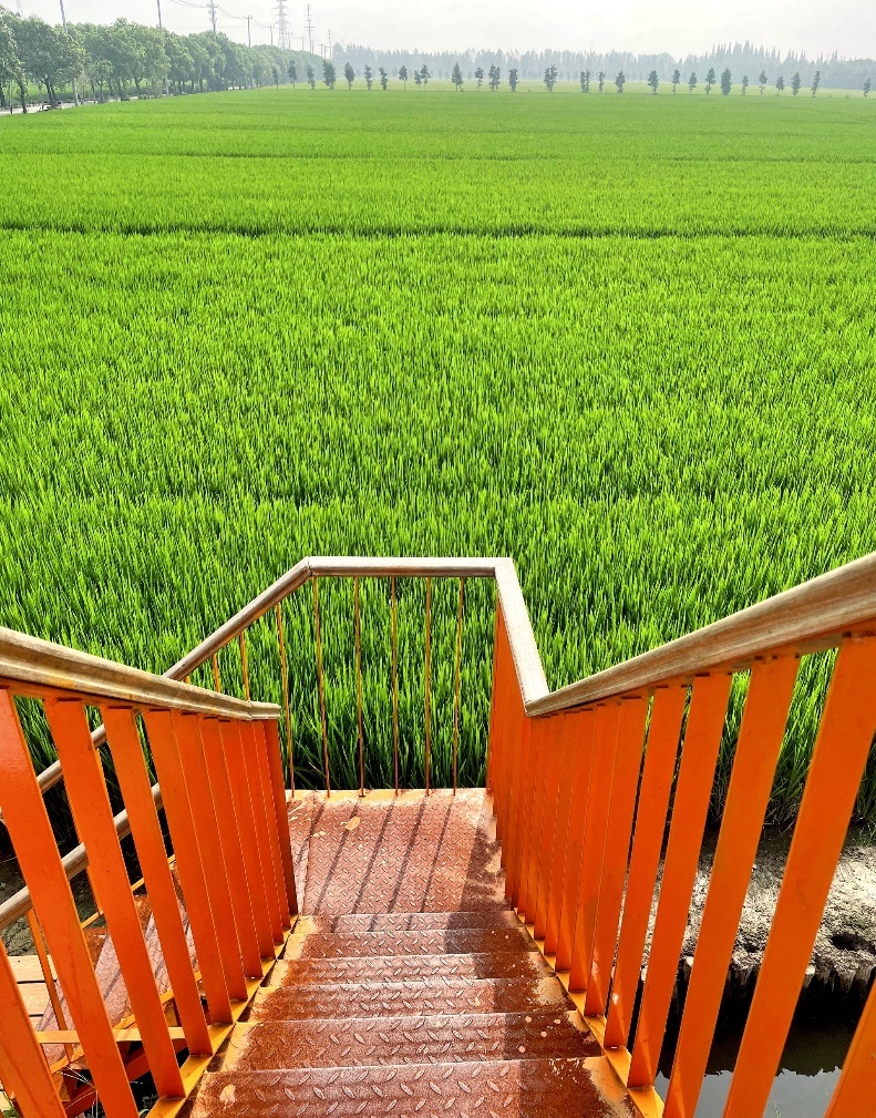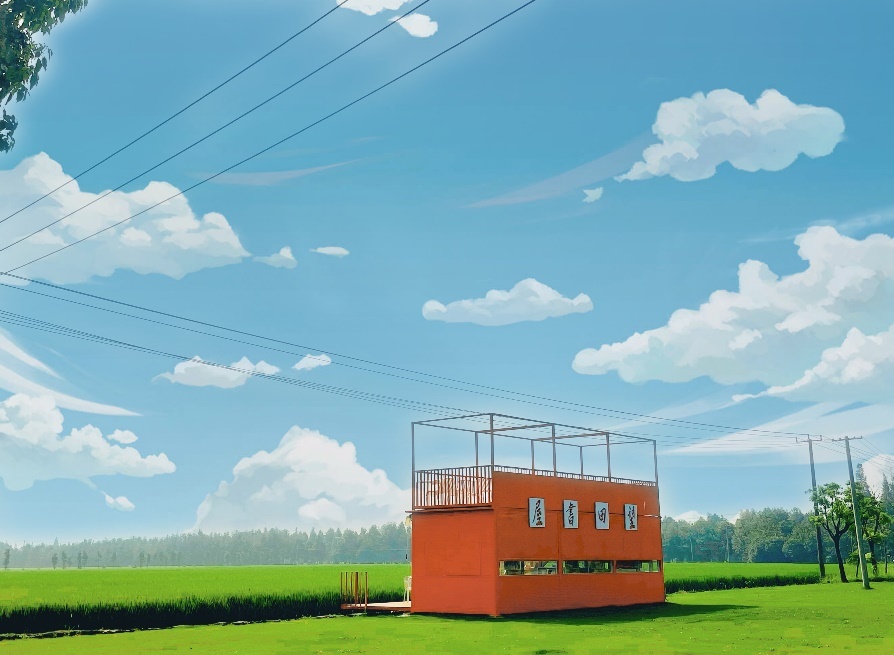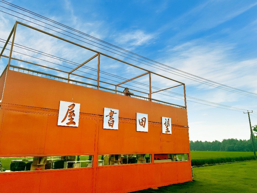 集装箱被安放在了一整片阡陌交通的粮田旁。湛蓝天空下,青青麦田旁,这座橙色的书屋分外夺目。登上二层平台极目远眺,微风吹过一望无际的田野奔向远方,蛙鸣声声似乎在预示着今年的丰收,颇有“采菊东篱下,悠然见南山”的怡然自得。兴奋的规划师们向村里提议把这座小小的书屋取名为“望田书屋”。除了抬目可见的归园田居的美景外,还包含了规划师们对美丽乡村建设和振兴的憧憬和希望。