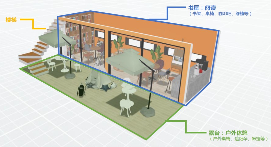 书屋很小,但要承载文化传承、村民交流、党建活动、亲子娱乐等多种功能,为了更好地利用有限的空间,规划师们集思广益,为望田书屋量身定制了功能策划和室内外家具布置方案。一层室内以陈列书架为主,在一角布置了咖啡吧和结对共建角,靠落地窗的一面则设置了一排休闲座椅,以供村民阅读和思考。一层室外有遮阳伞和休息座椅,日常党建和亲子活动可以放在此处,与室内互不干扰;二层平台摆放桌椅,供村民们日常交流休憩。在天气晴好、气温宜人的日子里,不失为一个登高望远、沉静心灵的好去处。