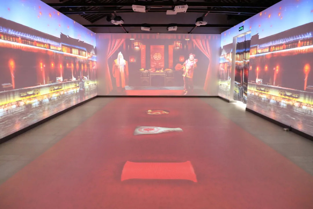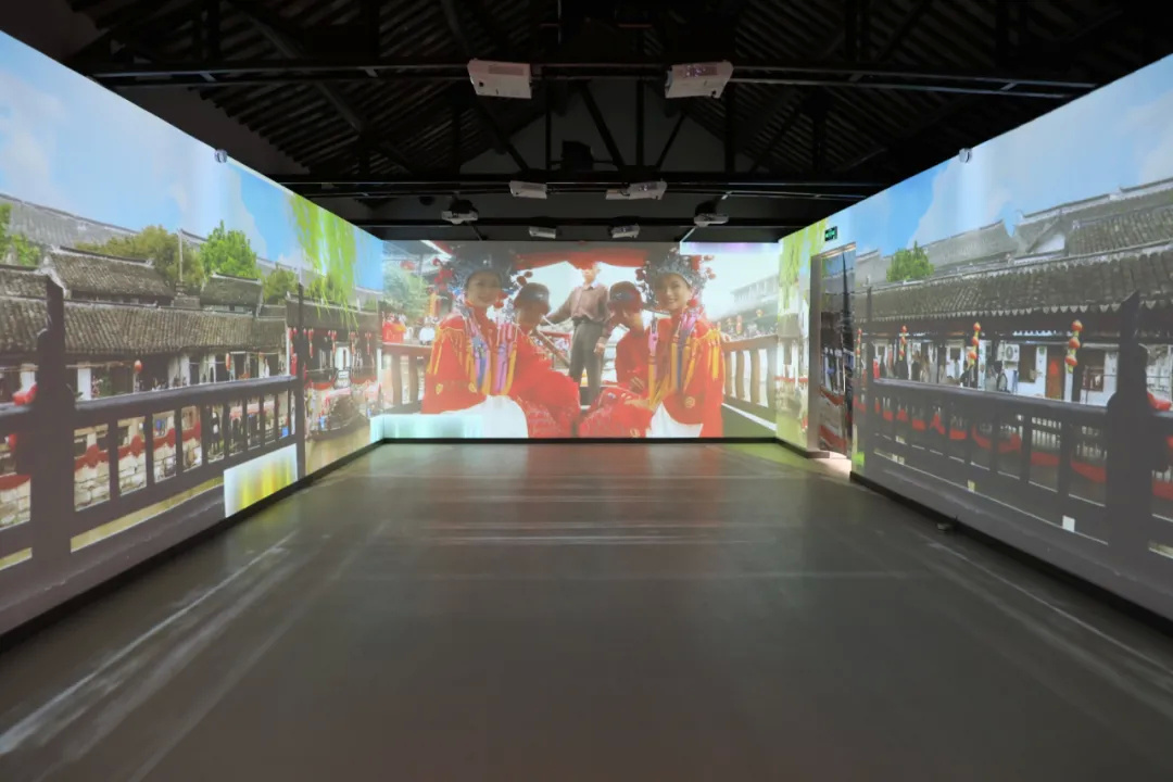 作为婚俗馆内的最大看点,展馆内还设置一块区域,利用大型3D全景影像互动多媒体技术,让游客可以以全新的视角、身临其境般的感受,来全方位体验枫泾水乡婚典的盛况。