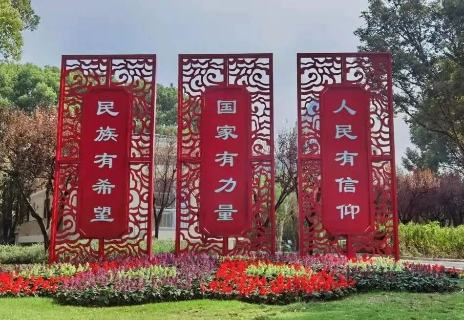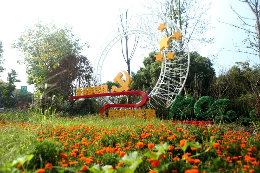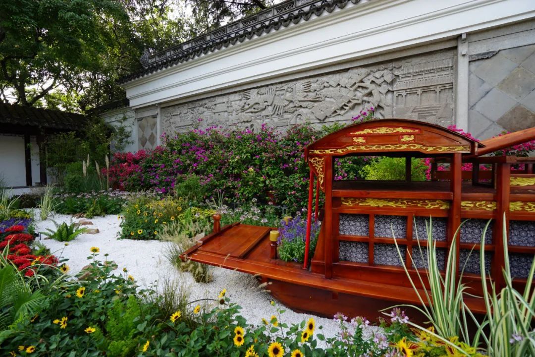 在古猗园南门照壁“复兴之路”景点,以南湖红船为主体,以深红和浅红色的三角梅为背景,配以多彩秋季观赏植物,如松果菊、向日葵、龙船花、观赏狼尾草等,展现了红船引领中华民族伟大复兴的浩荡航程。