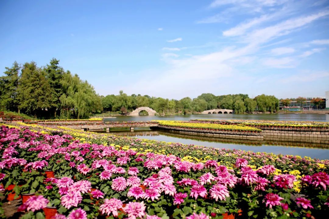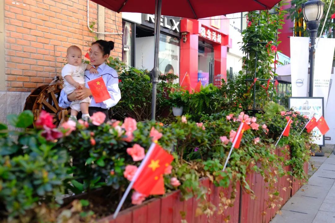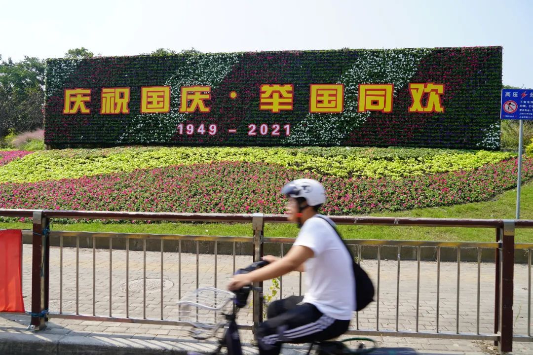 在安亭农业生态园,步道两侧鲜花簇簇,或摆出“国庆”字样,或摆出爱心造型,五彩缤纷。