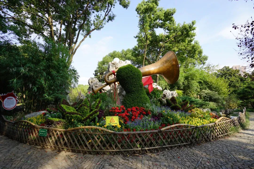 在古猗园小草坪西侧的“奏响赞歌”景点,立体花坛已“奏响”胜利的号角。几朵立体的大花与之呼应,向日葵、鸡冠花、鼠尾草多彩缤纷的秋花簇拥期间,仿佛在歌颂今天的美好生活。