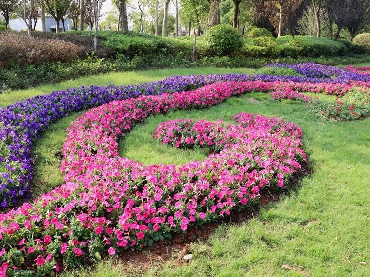 一旁用红色、紫色牵牛花组成的祥云图案绵延近十余米,增添了一份喜庆氛围。