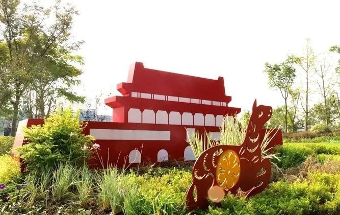 在汇源广场入口处的草坪上,一组抽象的城楼造型和寓意吉祥的小羊造型搭配千鸟花、金叶满天星、花叶络石和亮晶女贞等色彩绚丽的花卉,格外引人注目。