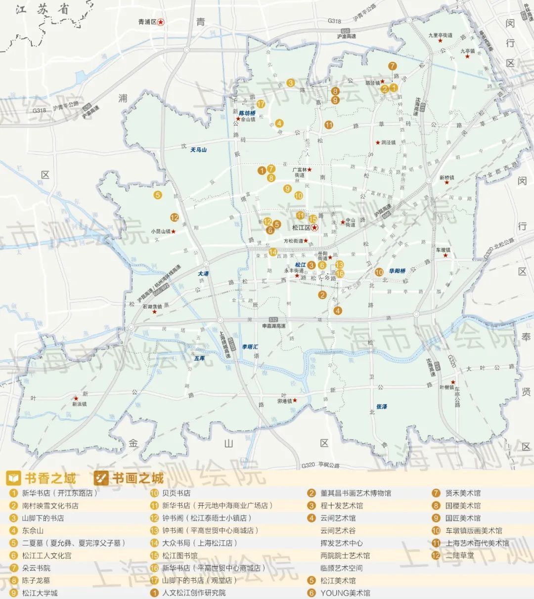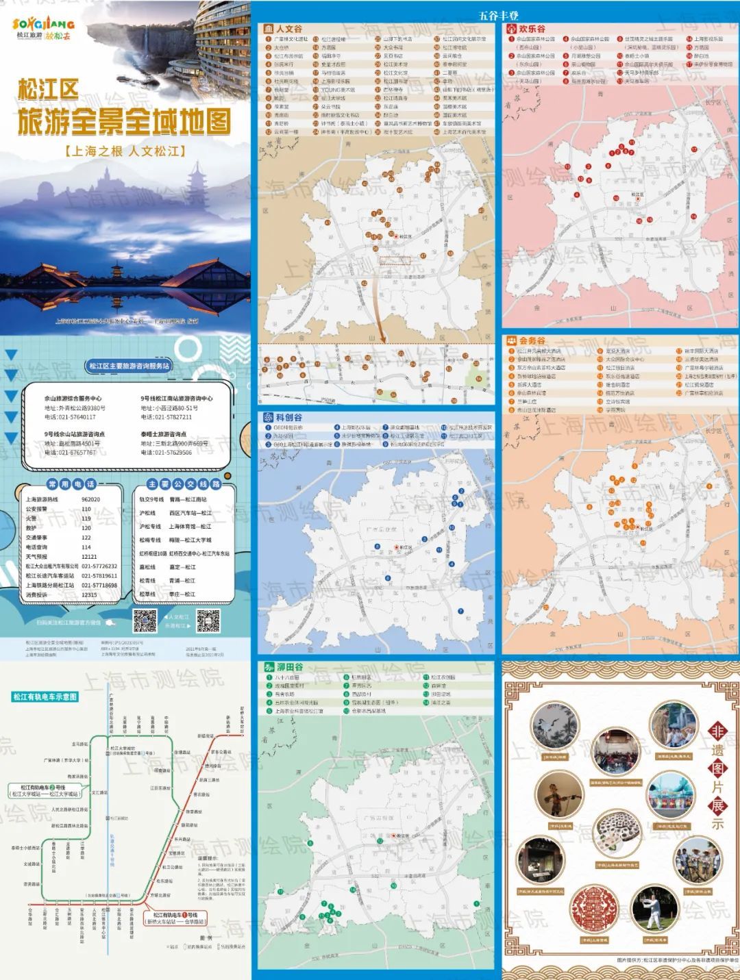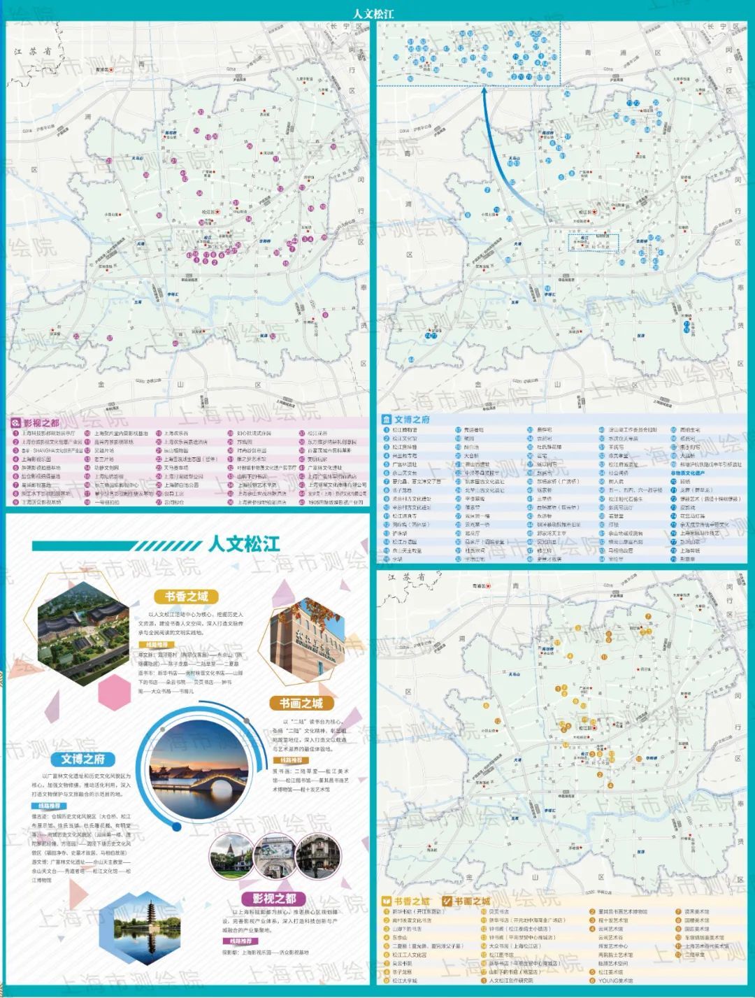 新版地图在原有“五谷丰登”全域旅游产品体系地图和人文松江地图的基础上,梳理文旅资源,将“人文松江”板块进一步细化,呈现“书香之域、书画之城、文博之府、影视之都”为特色的四大主题地图。