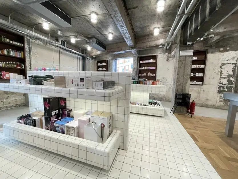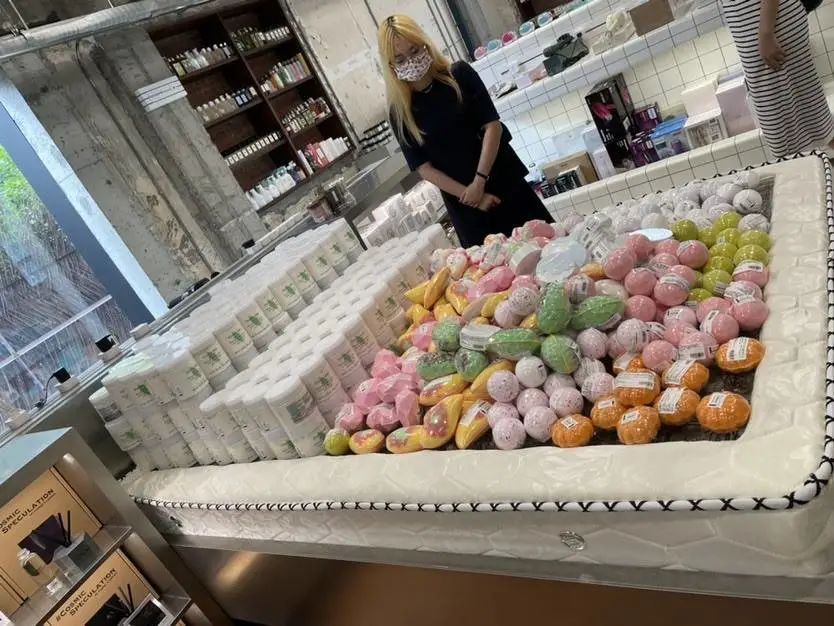 拾级而上,二层起就为购物的起点,同时这里也被装修成老上海房间的模样,特色的梳妆台、床头柜、浴缸都变成了货架,数百种护肤品、面膜、彩妆、精油球、润体乳、香薰、香水、个护家电等商品错落有致的摆在上面,呈现出一种民国时代与现代的碰撞之感。