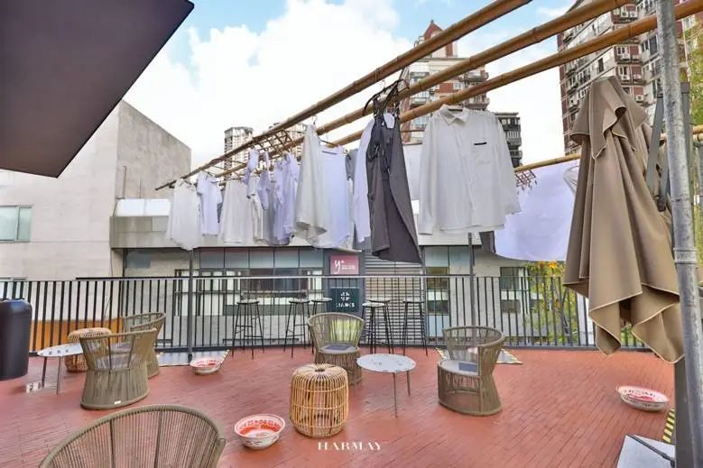 而顶楼阳台则被打造成了老上海里弄阳台的风格。晾晒衣服的竹竿,随风飘扬的服装,让人仿佛一夜间回到了小时候的上海。惬意的午后,在此俯瞰热闹的街道,凝望远方的行人,或是在角落的藤椅上闭眼休憩,同时顶楼也可以一处经典的屋顶聚会场所。