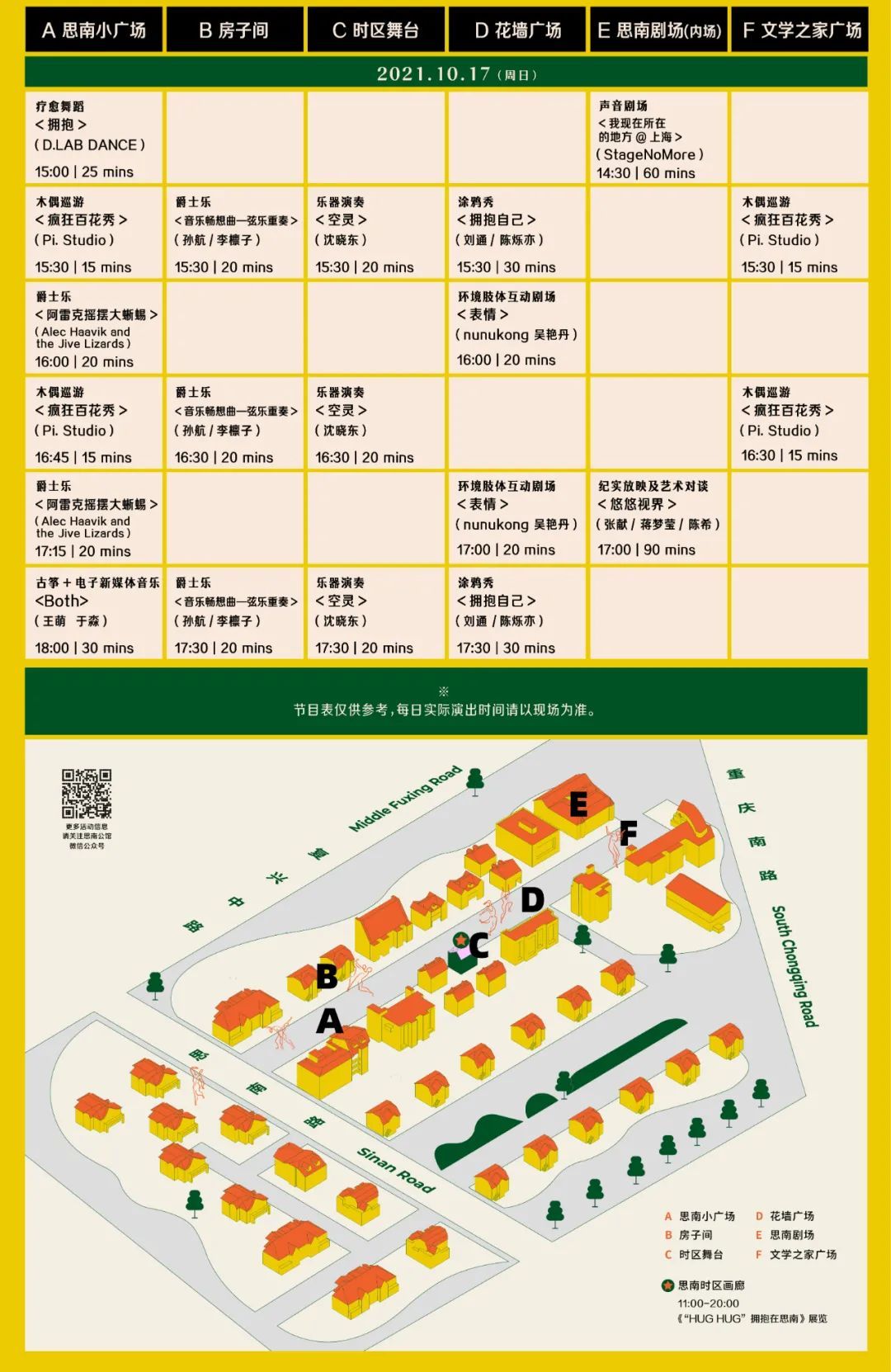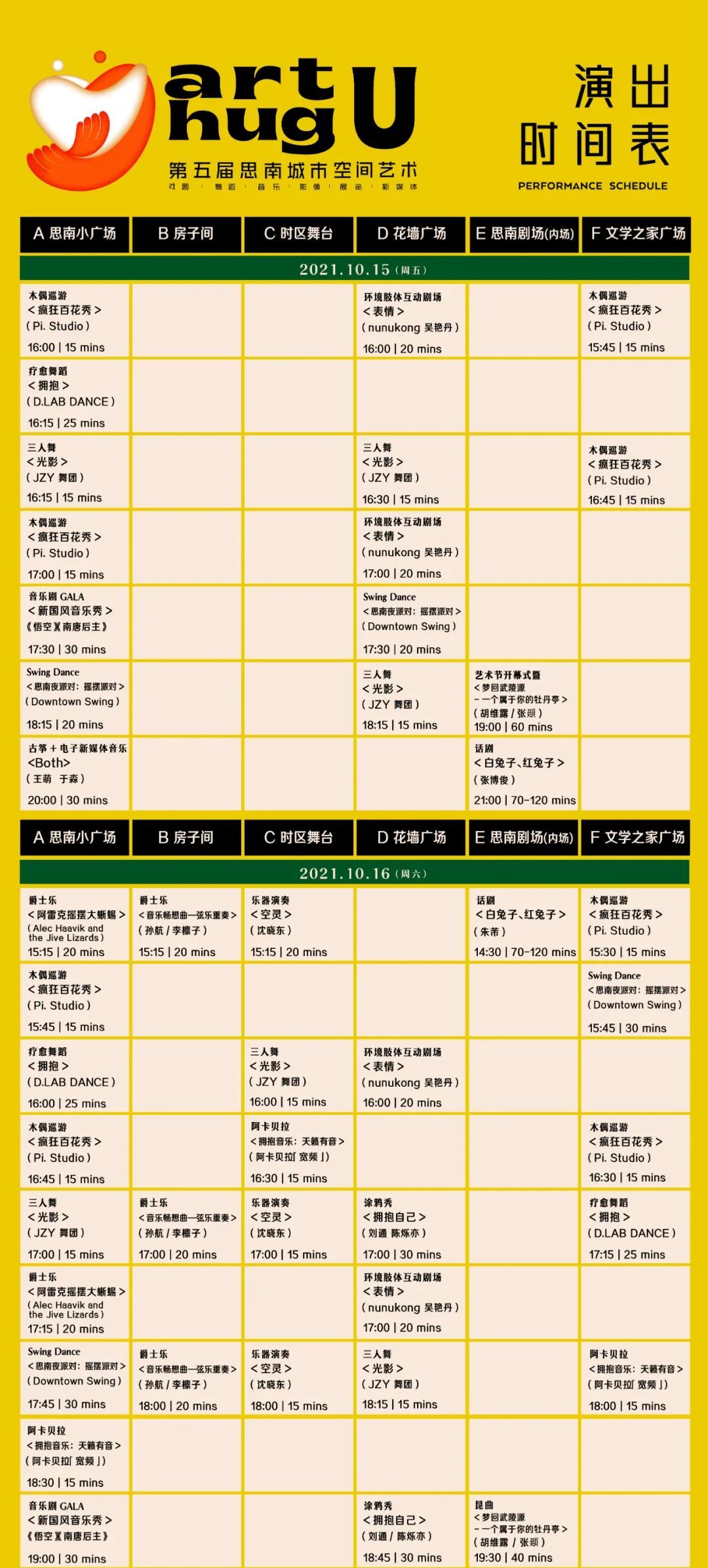 思南城市空间露天舞台、思南剧场、思南时区画廊这3个空间将上演包括戏剧、舞蹈、音乐、影像、展览、新媒体等6种艺术表现形式,内容上贯穿古今、融汇中西。致力于为公众打造形式多元、充满惊喜、注重互动的艺术节。