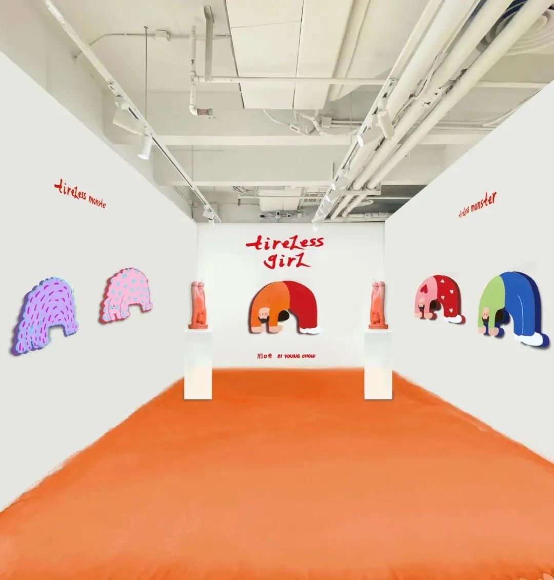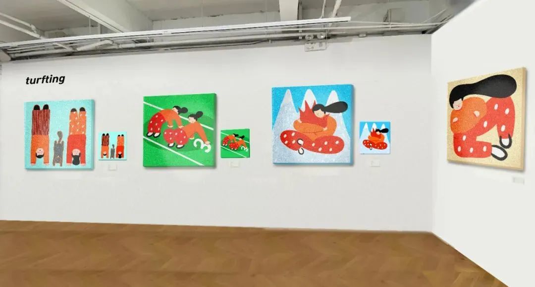 本次艺术展览周日央首次以思南为背景,创作了《拥抱在思南》的全新系列插画作品,并用异形立牌装置的方式呈现,公众走进时区画廊可以看到爱穿橘色衣服的圆脸女孩或拥抱、或躺在屋檐上、或在逗猫,全方位感受元气女孩的活力,展览中的部分作品更是以特殊工艺(Turfting)把“拥抱女孩”融在了毛绒挂毯中,让公众仿佛触手可及般感受到拥抱的力量、治愈的温暖。