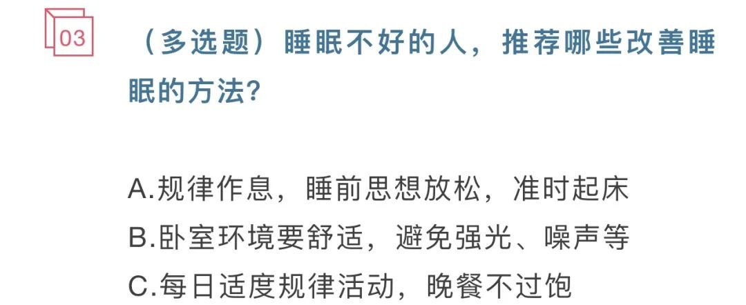 改善睡眠的方法有:规律作息,睡前放松,准时起床;卧室环境要舒适,温度适宜,避免强光、噪声等;每日适度规律活动;晚餐不过饱;失眠者白天避免午睡。