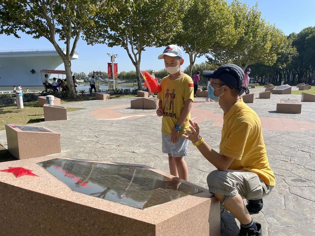在东方绿舟红军足印纪念园内,不少家长带领孩子参观来自全国各地100位老红军的足迹,每个足印都有一个足印碑,碑上刻有老红军的姓名和留印时间等资料信息。大家在足印纪念园漫步,可以透过历史品味那段艰难而光荣的岁月。