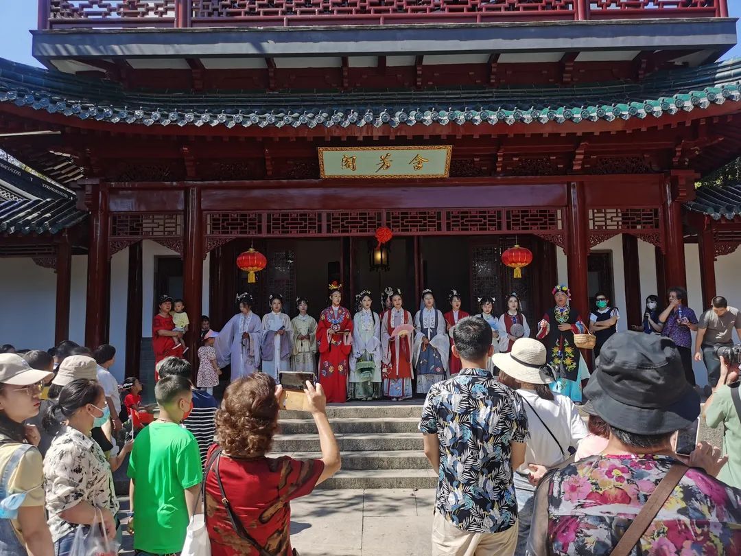 最热闹的还属大观楼前的省亲仪式和每天两场的金钗游园,身着古装的演员们还会适时与游客互动,甚至邀请游客一起参与情景演绎,飘然若仙的“十二金钗”和幽静典雅的园林建筑令人流连忘返。
